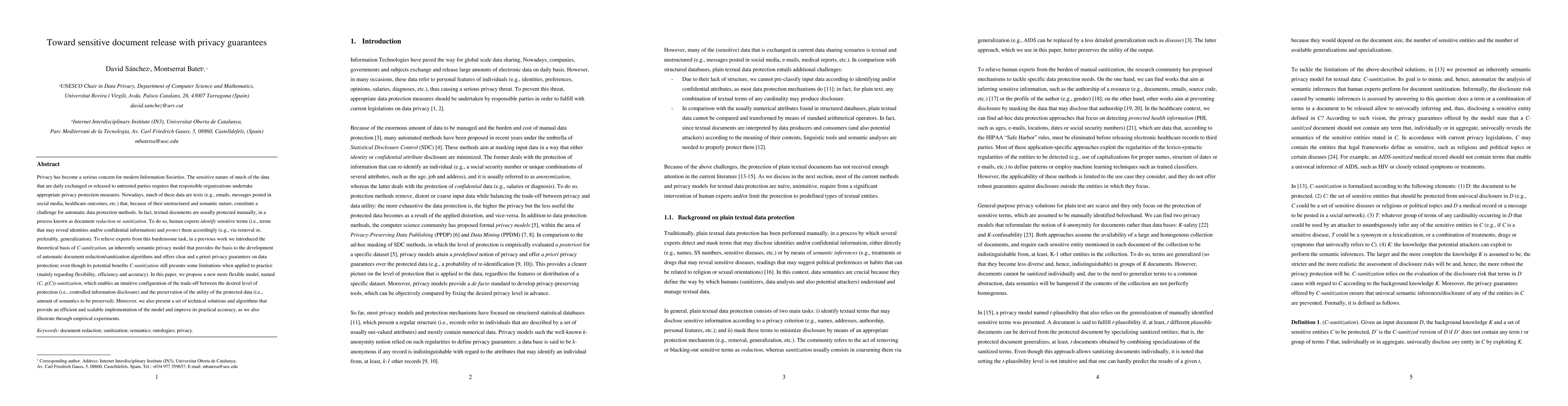 This paper introduces a new model, (C, g(C))-sanitization, to improve the automatic release of sensitive documents with enhanced privacy guarantees. It aims to balance the level of information disclosure with the preservation of document semantics, offering practical solutions and algorithms to address previous limitations in flexibility, efficiency, and accuracy.