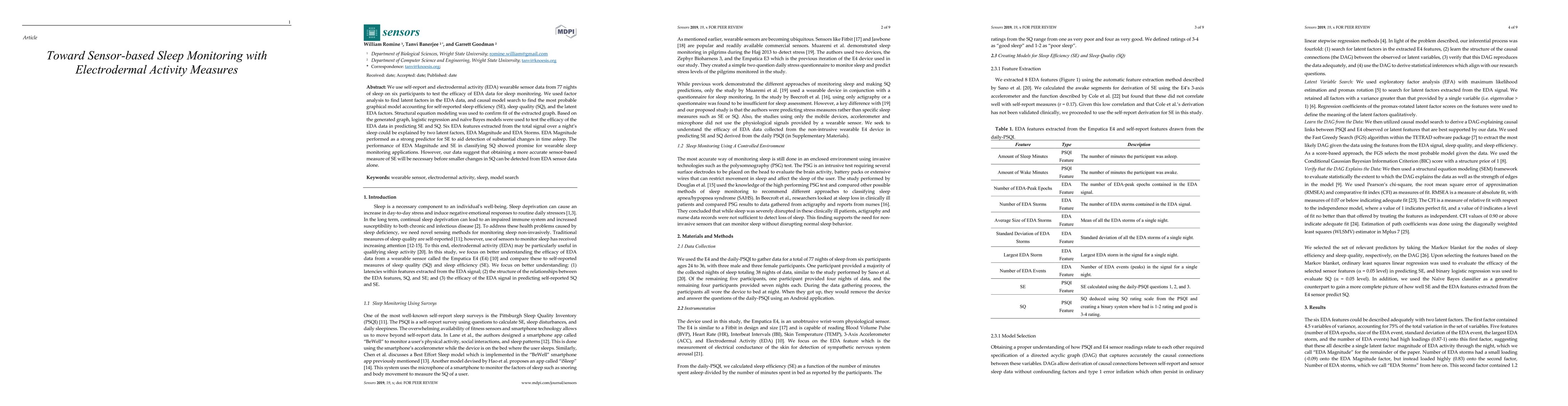 Researchers tested electrodermal activity (EDA) data from 77 nights of sleep to develop a wearable sensor for monitoring sleep efficiency and quality. EDA Magnitude performed as a strong predictor for detecting changes in time asleep.