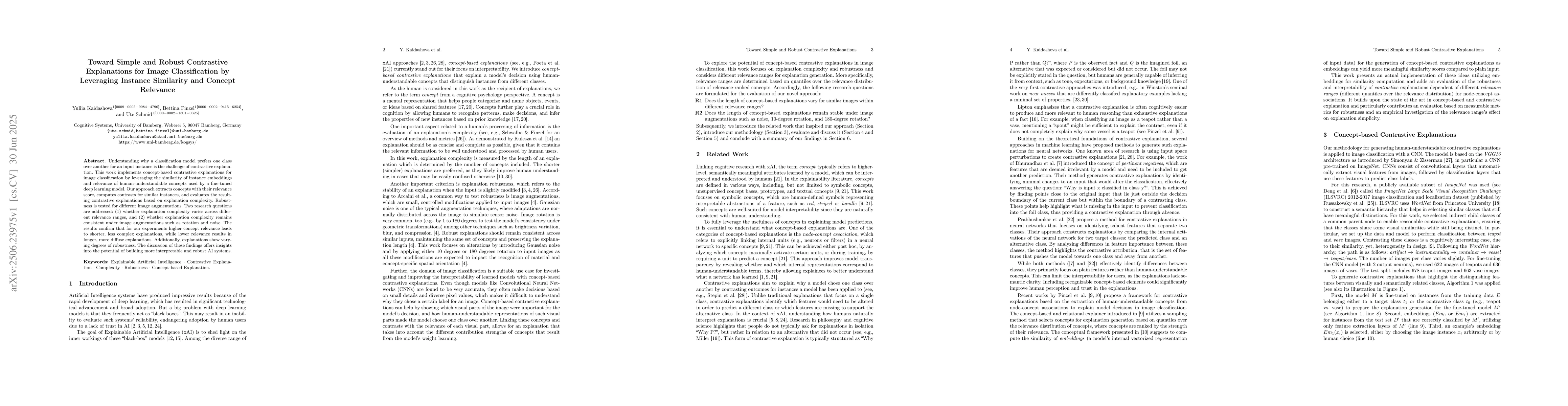 Understanding why a classification model prefers one class over another for an input instance is the challenge of contrastive explanation. This work implements concept-based contrastive explanations for image classification by leveraging the similarity of instance embeddings and relevance of human-understandable concepts used by a fine-tuned deep learning model. Our approach extracts concepts with their relevance score, computes contrasts for similar instances, and evaluates the resulting contrastive explanations based on explanation complexity. Robustness is tested for different image augmentations. Two research questions are addressed: (1) whether explanation complexity varies across different relevance ranges, and (2) whether explanation complexity remains consistent under image augmentations such as rotation and noise. The results confirm that for our experiments higher concept relevance leads to shorter, less complex explanations, while lower relevance results in longer, more diffuse explanations. Additionally, explanations show varying degrees of robustness. The discussion of these findings offers insights into the potential of building more interpretable and robust AI systems.