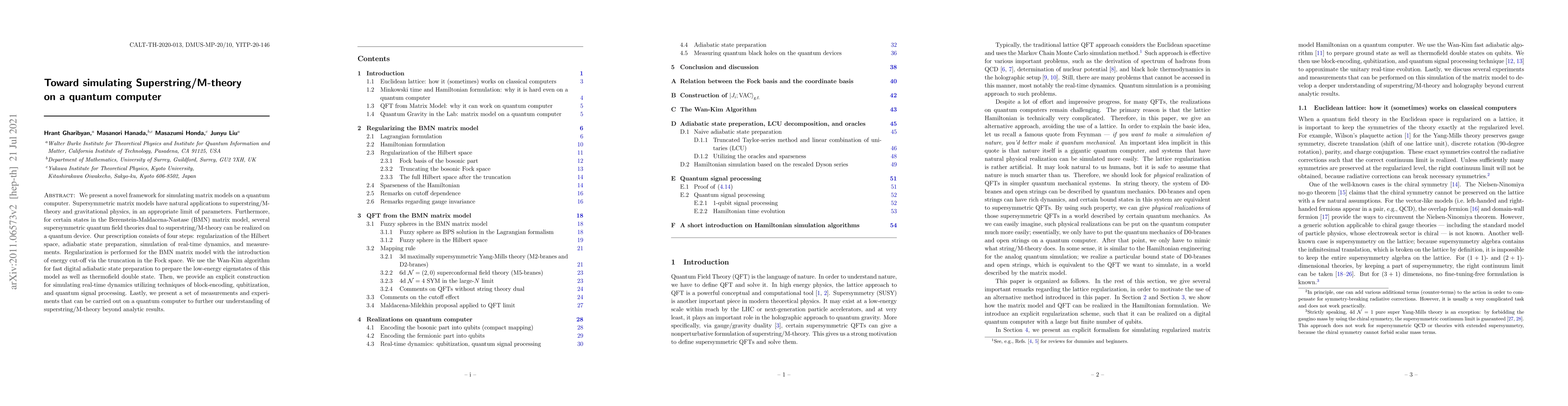 This paper proposes a framework for simulating supersymmetric matrix models on a quantum computer, aiming to explore superstring/M-theory and gravitational physics. The method includes four steps: regularization, adiabatic state preparation, real-time dynamics simulation, and measurements, utilizing techniques like block-encoding and quantum signal processing.