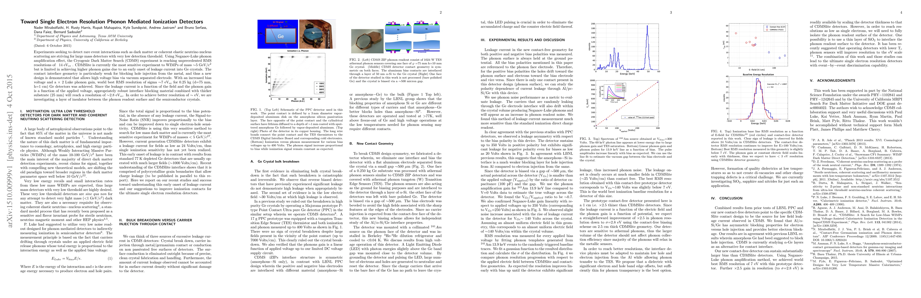 Experiments seeking to detect rare event interactions such as dark matter or coherent elastic neutrino nucleus scattering are striving for large mass detectors with very low detection threshold. Using Neganov-Luke phonon amplification effect, the Cryogenic Dark Matter Search (CDMS) experiment is reaching unprecedented RMS resolutions of ~ 14 eV$_{ee}$ . CDMSlite is currently the most sensitive experiment to WIMPs of mass $\sim$5 GeV/c$^{2}$ but is limited in achieving higher phonon gains due to an early onset of leakage current into Ge crystals. The contact interface geometry is particularly weak for blocking hole injection from the metal, and thus a new design is demonstrated that allows high voltage bias via vacuum separated electrode. With an increased bias voltage and a $\times$ 2 Luke phonon gain, world best RMS resolution of sigma $\sim$7 eV$_{ee}$ for 0.25 kg (d=75 mm, h=1 cm) Ge detectors was achieved. Since the leakage current is a function of the field and the phonon gain is a function of the applied voltage, appropriately robust interface blocking material combined with thicker substrate (25 mm) will reach a resolution of $\sim$2.8 eV$_{ee}$. In order to achieve better resolution of $\sim$ eV, we are investigating a layer of insulator between the phonon readout surface and the semiconductor crystals.