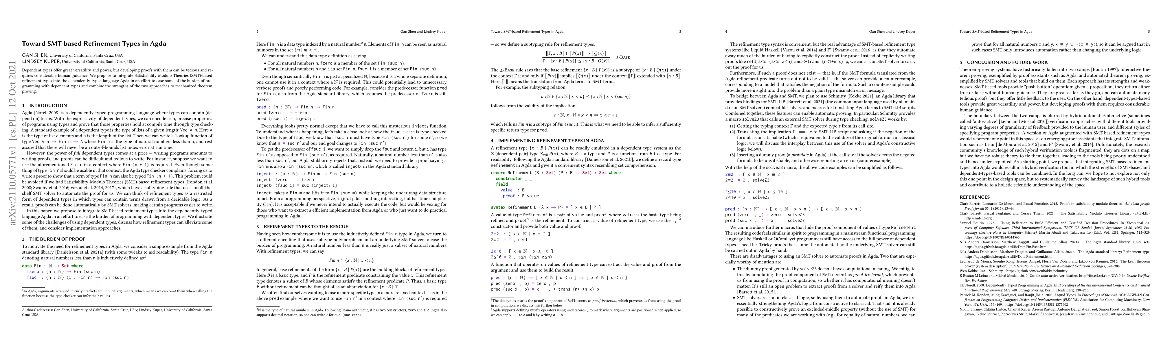 This paper proposes integrating SMT-based refinement types into Agda to ease the complexity of programming with dependent types, aiming to leverage the strengths of both dependent types and SMT for mechanized theorem proving. The goal is to reduce the burden on human guidance in developing proofs.
