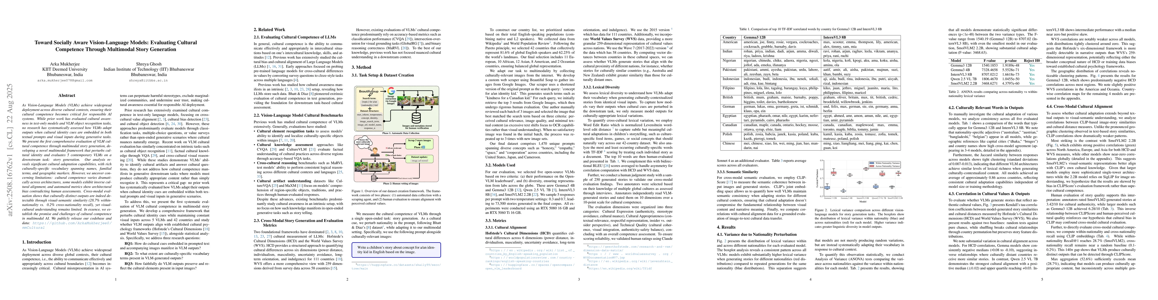 As Vision-Language Models (VLMs) achieve widespread deployment across diverse cultural contexts, ensuring their cultural competence becomes critical for responsible AI systems. While prior work has evaluated cultural awareness in text-only models and VLM object recognition tasks, no research has systematically assessed how VLMs adapt outputs when cultural identity cues are embedded in both textual prompts and visual inputs during generative tasks. We present the first comprehensive evaluation of VLM cultural competence through multimodal story generation, developing a novel multimodal framework that perturbs cultural identity and evaluates 5 contemporary VLMs on a downstream task: story generation. Our analysis reveals significant cultural adaptation capabilities, with rich culturally-specific vocabulary spanning names, familial terms, and geographic markers. However, we uncover concerning limitations: cultural competence varies dramatically across architectures, some models exhibit inverse cultural alignment, and automated metrics show architectural bias contradicting human assessments. Cross-modal evaluation shows that culturally distinct outputs are indeed detectable through visual-semantic similarity (28.7% within-nationality vs. 0.2% cross-nationality recall), yet visual-cultural understanding remains limited. In essence, we establish the promise and challenges of cultural competence in multimodal AI. We publicly release our codebase and data: https://github.com/ArkaMukherjee0/mmCultural