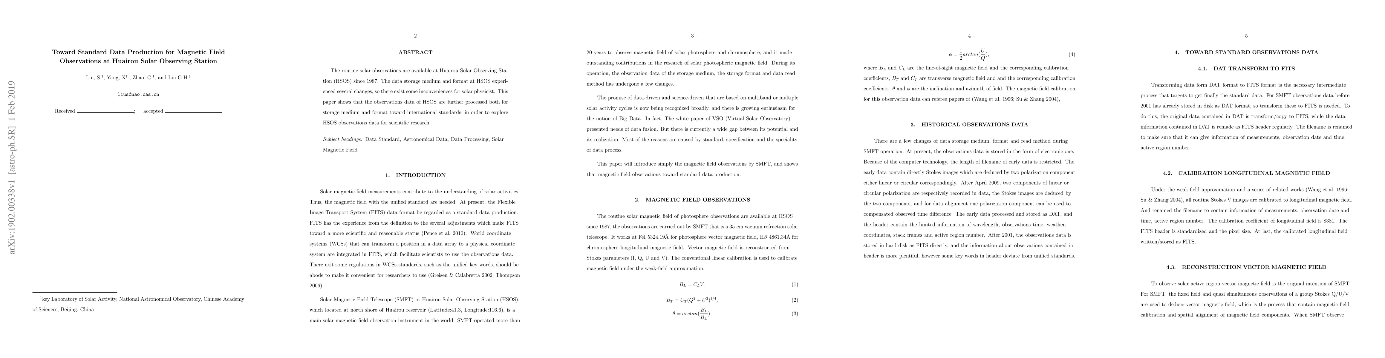 The productions of data with internationally agreed standards are the common pursuits for all astronomical observation instruments both ground and spacebased undoubtedly, Since standard data to facilitate the use of scientific research. The routine solar observations are available at Huairou Solar Observing Station (HSOS) since 1987, which should be regarded as one main solar observations in the world. The data storage medium and format at HSOS experienced several changes, so there exist some inconveniences for solar physicist. This paper shows that the observations data of HSOS are further processed both for storage medium and format toward international standards, in order to explore HSOS observations data for scientific research.