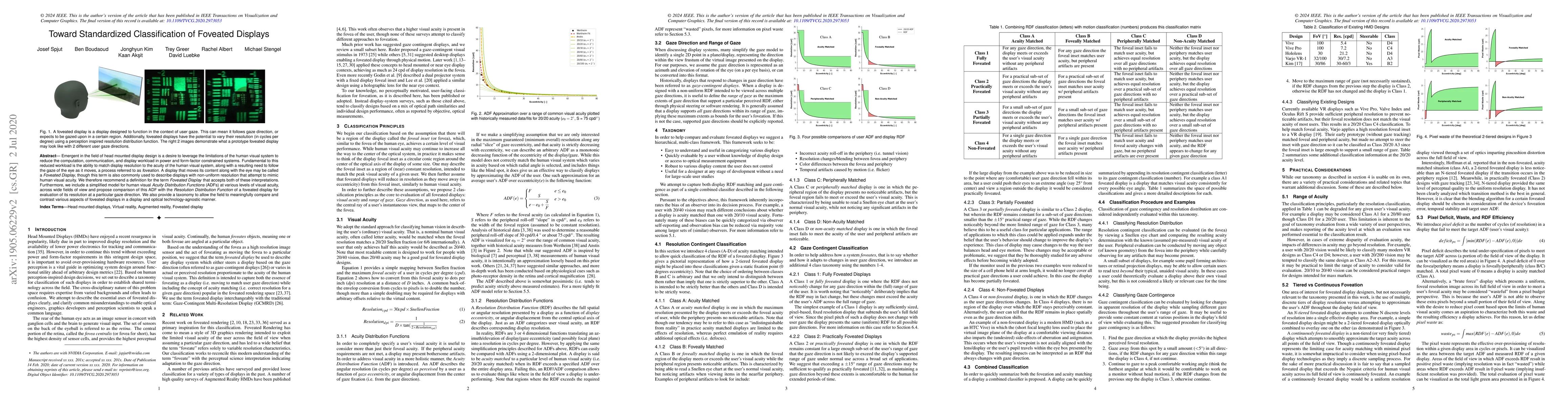 This paper proposes a standardized classification for foveated displays, aiming to reduce computational and display workload by aligning display resolution with human visual acuity. It introduces a taxonomy and a simplified model for evaluating the resolution distribution function of foveated displays against human visual acuity distribution functions.