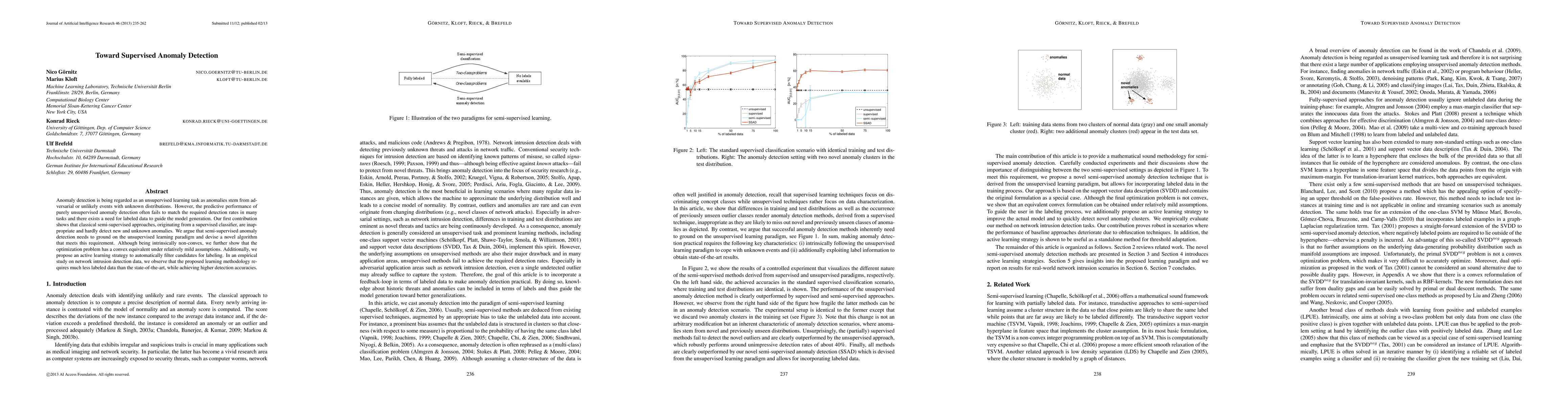 Anomaly detection is being regarded as an unsupervised learning task as anomalies stem from adversarial or unlikely events with unknown distributions. However, the predictive performance of purely unsupervised anomaly detection often fails to match the required detection rates in many tasks and there exists a need for labeled data to guide the model generation. Our first contribution shows that classical semi-supervised approaches, originating from a supervised classifier, are inappropriate and hardly detect new and unknown anomalies. We argue that semi-supervised anomaly detection needs to ground on the unsupervised learning paradigm and devise a novel algorithm that meets this requirement. Although being intrinsically non-convex, we further show that the optimization problem has a convex equivalent under relatively mild assumptions. Additionally, we propose an active learning strategy to automatically filter candidates for labeling. In an empirical study on network intrusion detection data, we observe that the proposed learning methodology requires much less labeled data than the state-of-the-art, while achieving higher detection accuracies.
