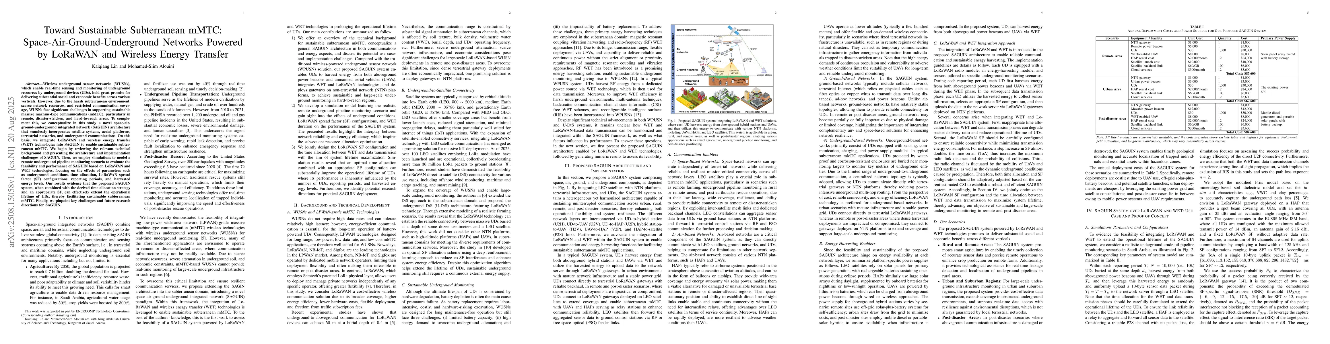 Wireless underground sensor networks (WUSNs), which enable real-time sensing and monitoring of underground resources by underground devices (UDs), hold great promise for delivering substantial social and economic benefits across various verticals. However, due to the harsh subterranean environment, scarce network resources, and restricted communication coverage, WUSNs face significant challenges in supporting sustainable massive machine-type communications (mMTC), particularly in remote, disaster-stricken, and hard-to-reach areas. To complement this, we conceptualize in this study a novel space-air-ground-underground integrated network (SAGUIN) architecture that seamlessly incorporates satellite systems, aerial platforms, terrestrial networks, and underground communications. On this basis, we integrate LoRaWAN and wireless energy transfer (WET) technologies into SAGUIN to enable sustainable subterranean mMTC. We begin by reviewing the relevant technical background and presenting the architecture and implementation challenges of SAGUIN. Then, we employ simulations to model a remote underground pipeline monitoring scenario to evaluate the feasibility and performance of SAGUIN based on LoRaWAN and WET technologies, focusing on the effects of parameters such as underground conditions, time allocation, LoRaWAN spread factor (SF) configurations, reporting periods, and harvested energy levels. Our results evidence that the proposed SAGUIN system, when combined with the derived time allocation strategy and an appropriate SF, can effectively extend the operational lifetime of UDs, thereby facilitating sustainable subterranean mMTC. Finally, we pinpoint key challenges and future research directions for SAGUIN.
