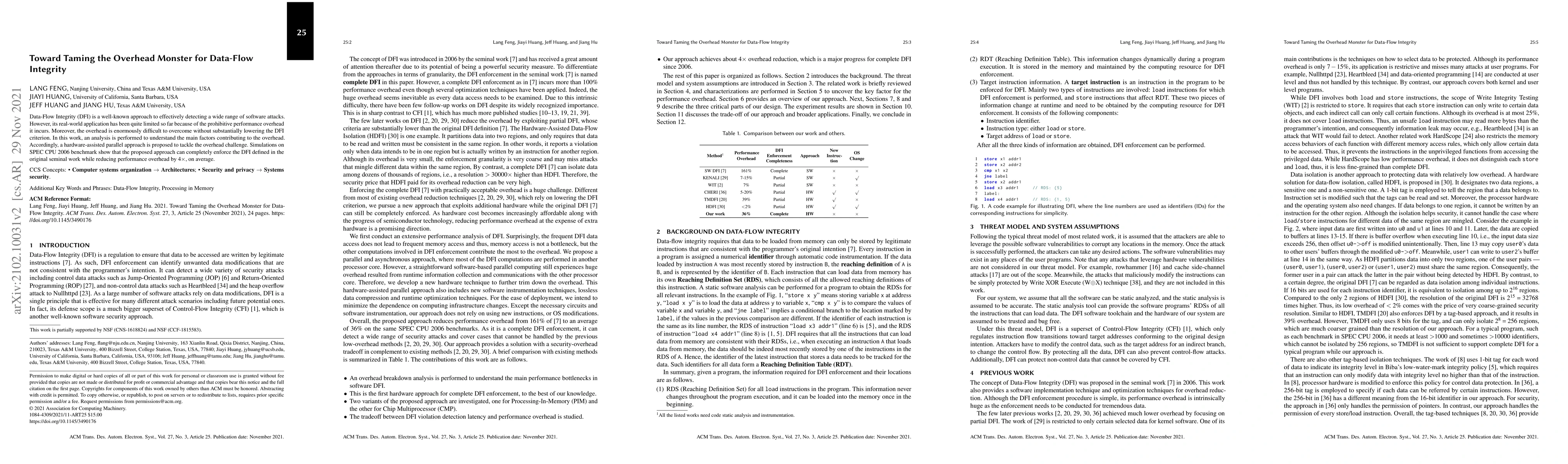 This paper analyzes the performance overhead of Data-Flow Integrity (DFI) and proposes a hardware-assisted parallel approach to mitigate it. Simulation results on SPEC CPU 2006 benchmarks show a 4x reduction in performance overhead while maintaining DFI enforcement.