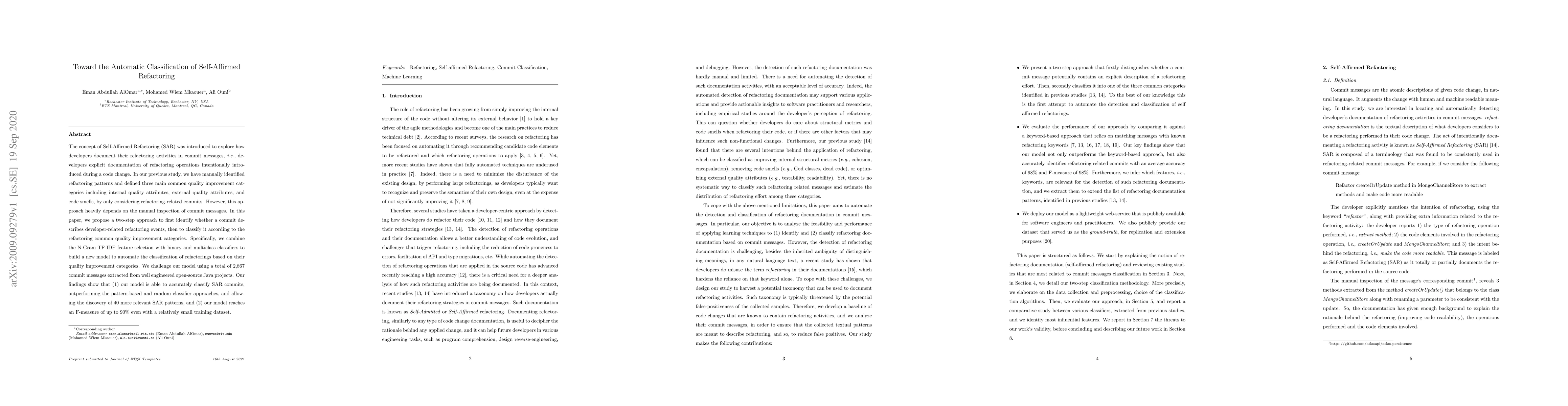 This paper proposes a two-step automated approach to classify Self-Affirmed Refactoring (SAR) commits based on quality improvement categories using N-Gram TF-IDF features and classifiers. The model outperforms manual and pattern-based methods, achieving up to 90% F-measure accuracy.
