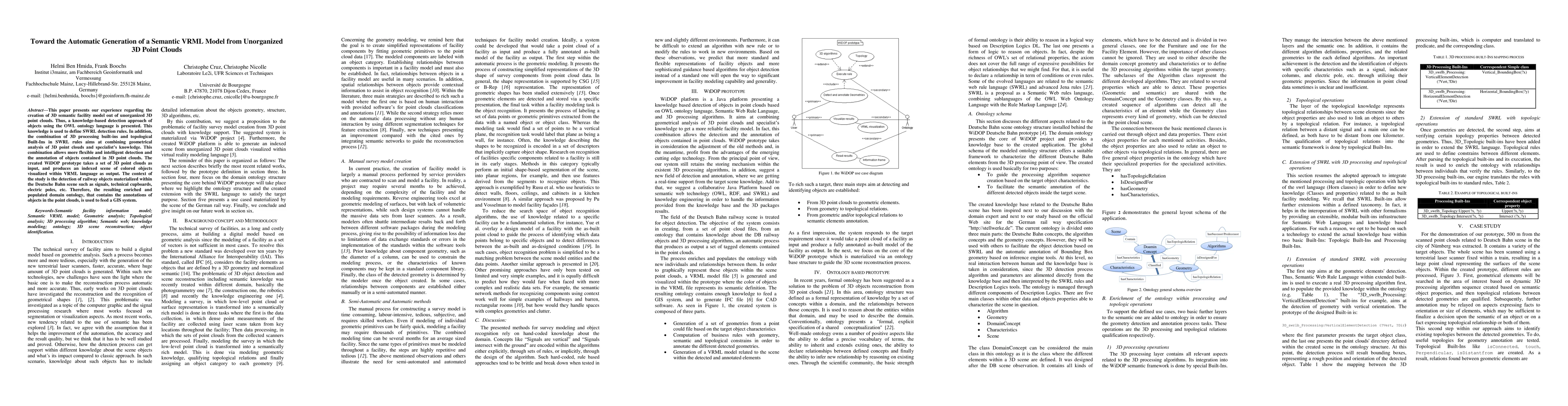 This paper develops a method for automatically generating a semantic VRML model from unorganized 3D point clouds, using OWL ontology and SWRL rules for object detection and annotation, and demonstrates its application in detecting railway objects in the Deutsche Bahn scene. The resulting ontology is utilized to enhance a GIS system.