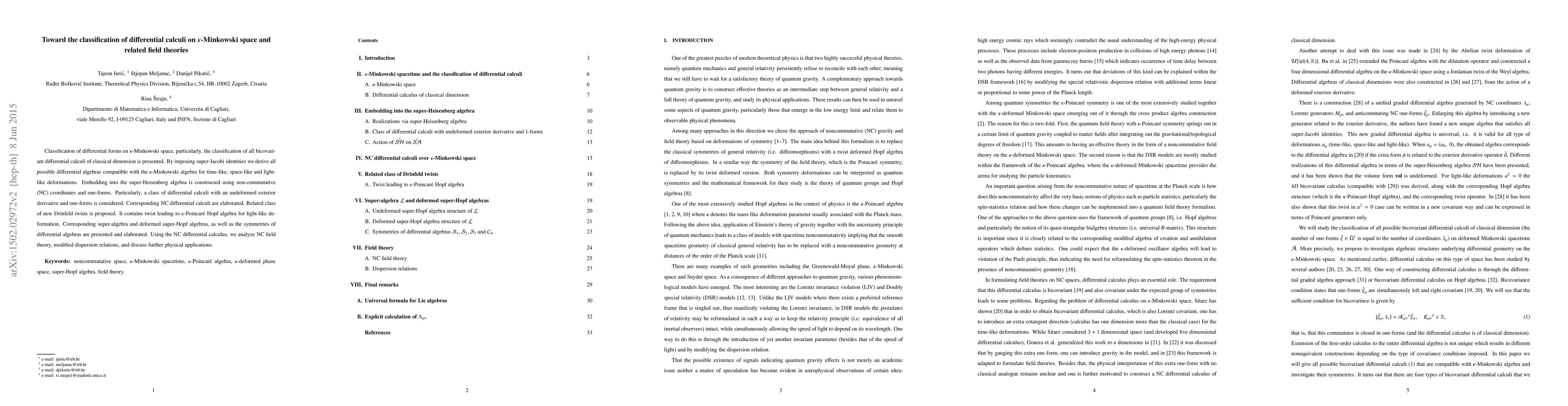 This paper classifies differential calculi on $\kappa$-Minkowski space, deriving all bicovariant differential algebras compatible with its deformations. It explores non-commutative coordinates, proposes new Drinfeld twists, and analyzes their implications for non-commutative field theory and modified dispersion relations.