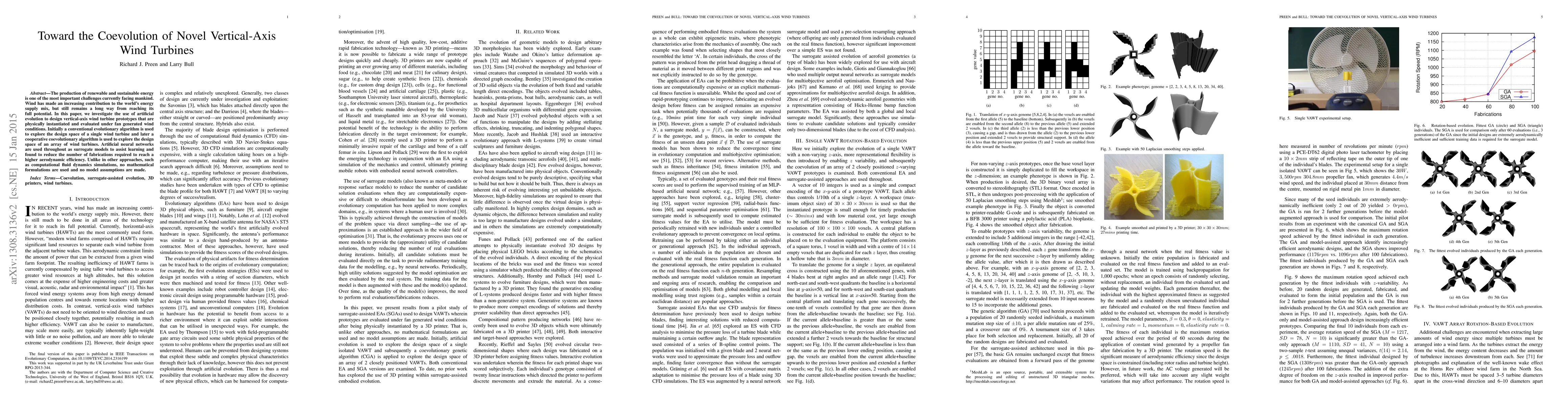 This paper explores the use of artificial evolution to design efficient vertical-axis wind turbines, employing evolutionary algorithms and coevolutionary strategies. The approach utilizes artificial neural networks to reduce fabrication costs and achieve higher aerodynamic efficiency without relying on mathematical formulations or assumptions.