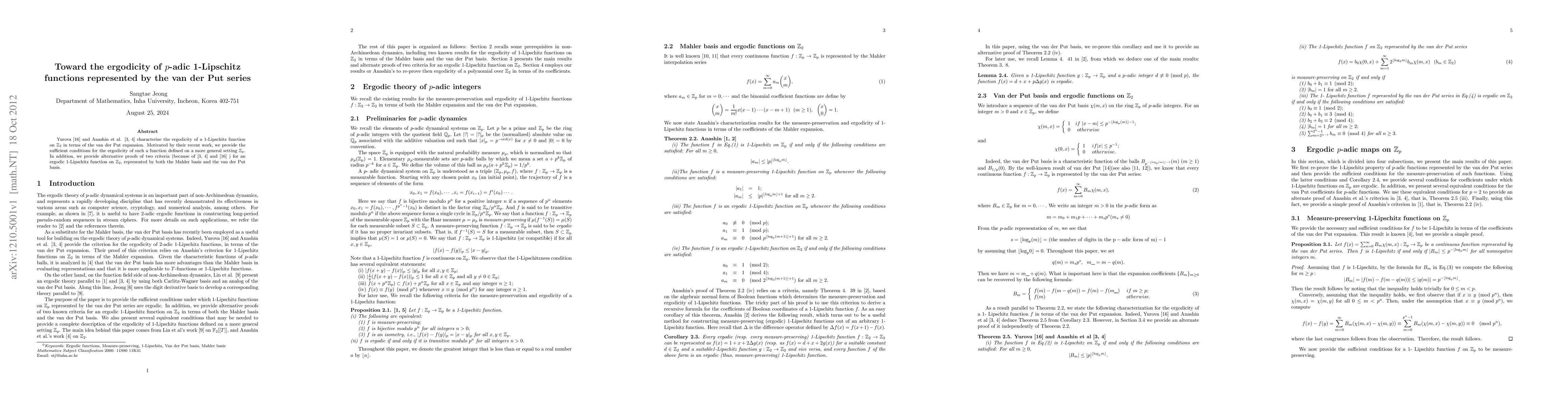 Yurova \cite{Yu} and Anashin et al. \cite{AKY1, AKY2} characterize the ergodicity of a 1-Lipschitz function on $\Z_2$ in terms of the van der Put expansion. Motivated by their recent work, we provide the sufficient conditions for the ergodicity of such a function defined on a more general setting $\Z_p$. In addition, we provide alternative proofs of two criteria (because of \cite{AKY1, AKY2} and \cite{Yu}) for an ergodic 1-Lipschitz function on $\Z_2,$ represented by both the Mahler basis and the van der Put basis.