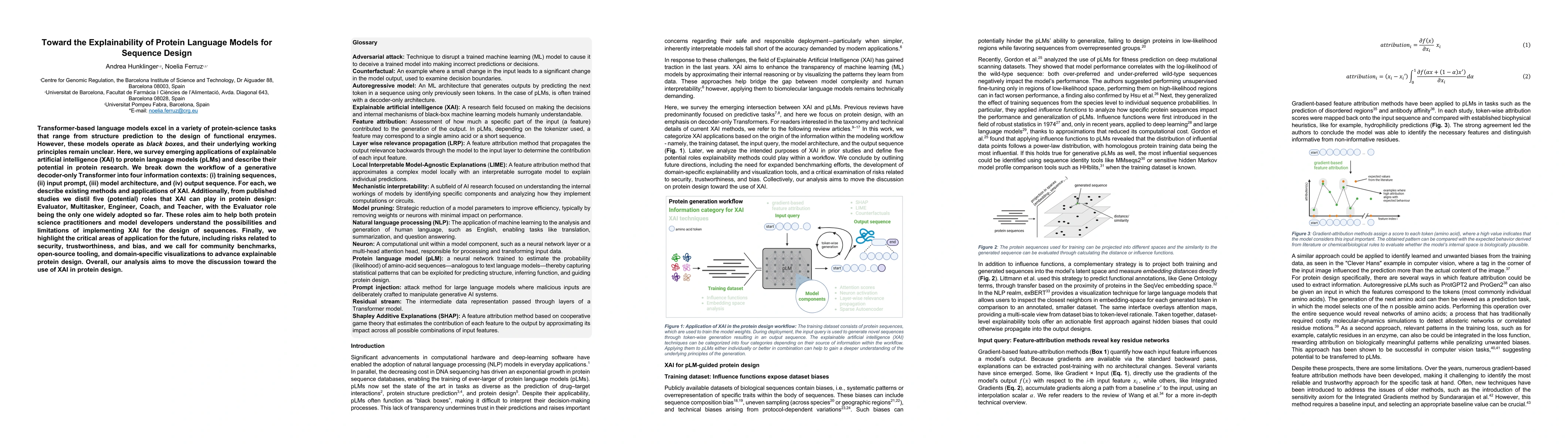 Transformer-based language models excel in a variety of protein-science tasks that range from structure prediction to the design of functional enzymes. However, these models operate as black boxes, and their underlying working principles remain unclear. Here, we survey emerging applications of explainable artificial intelligence (XAI) to protein language models (pLMs) and describe their potential in protein research. We break down the workflow of a generative decoder-only Transformer into four information contexts: (i) training sequences, (ii) input prompt, (iii) model architecture, and (iv) output sequence. For each, we describe existing methods and applications of XAI. Additionally, from published studies we distil five (potential) roles that XAI can play in protein design: Evaluator, Multitasker, Engineer, Coach, and Teacher, with the Evaluator role being the only one widely adopted so far. These roles aim to help both protein science practitioners and model developers understand the possibilities and limitations of implementing XAI for the design of sequences. Finally, we highlight the critical areas of application for the future, including risks related to security, trustworthiness, and bias, and we call for community benchmarks, open-source tooling, and domain-specific visualizations to advance explainable protein design. Overall, our analysis aims to move the discussion toward the use of XAI in protein design.