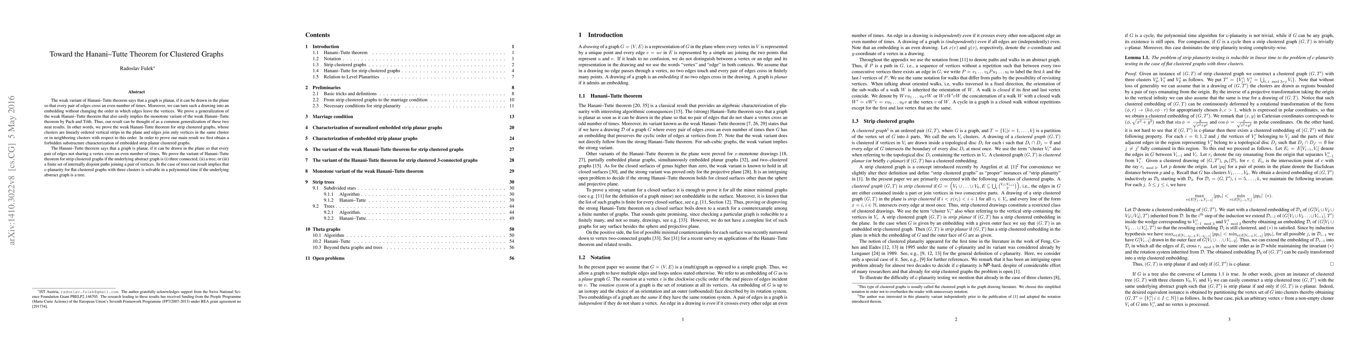 The weak variant of Hanani-Tutte theorem says that a graph is planar, if it can be drawn in the plane so that every pair of edges cross an even number of times. Moreover, we can turn such a drawing into an embedding without changing the order in which edges leave the vertices. We prove a generalization of the weak Hanani-Tutte theorem that also easily implies the monotone variant of the weak Hanani-Tutte theorem by Pach and T\'oth. Thus, our result can be thought of as a common generalization of these two neat results. In other words, we prove the weak Hanani-Tutte theorem for strip clustered graphs, whose clusters are linearly ordered vertical strips in the plane and edges join only vertices in the same cluster or in neighboring clusters with respect to this order. In order to prove our main result we first obtain a forbidden substructure characterization of embedded strip clustered planar graphs. The Hanani-Tutte theorem says that a graph is planar, if it can be drawn in the plane so that every pair of edges not sharing a vertex cross an even number of times. We prove the variant of Hanani-Tutte theorem for strip clustered graphs if the underlying abstract graph is three connected or a tree. In the case of trees our result implies that c-planarity for flat clustered graphs with three clusters is solvable in a polynomial time if the underlying abstract graph is a tree. The proof of the latter result combines our forbidden substructure characterization of embedded strip clustered planar graphs with Tucker's characterization of 0-1 matrices with consecutive ones property.