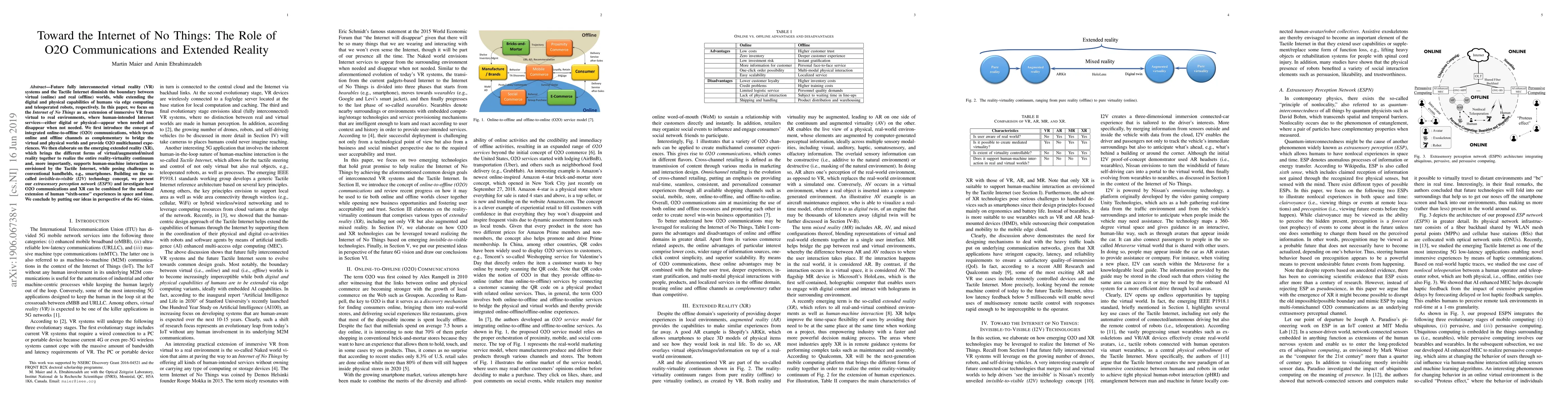 Future fully interconnected virtual reality (VR) systems and the Tactile Internet diminish the boundary between virtual (online) and real (offline) worlds, while extending the digital and physical capabilities of humans via edge computing and teleoperated robots, respectively. In this paper, we focus on the Internet of No Things as an extension of immersive VR from virtual to real environments, where human-intended Internet services - either digital or physical - appear when needed and disappear when not needed. We first introduce the concept of integrated online-to-offline (O2O) communications, which treats online and offline channels as complementary to bridge the virtual and physical worlds and provide O2O multichannel experiences. We then elaborate on the emerging extended reality (XR), which brings the different forms of virtual/augmented/mixed reality together to realize the entire reality-virtuality continuum and, more importantly, supports human-machine interaction as envisioned by the Tactile Internet, while posing challenges to conventional handhelds, e.g., smartphones. Building on the so-called invisible-to-visible (I2V) technology concept, we present our extrasensory perception network (ESPN) and investigate how O2O communications and XR can be combined for the nonlocal extension of human "sixth-sense" experiences in space and time. We conclude by putting our ideas in perspective of the 6G vision.