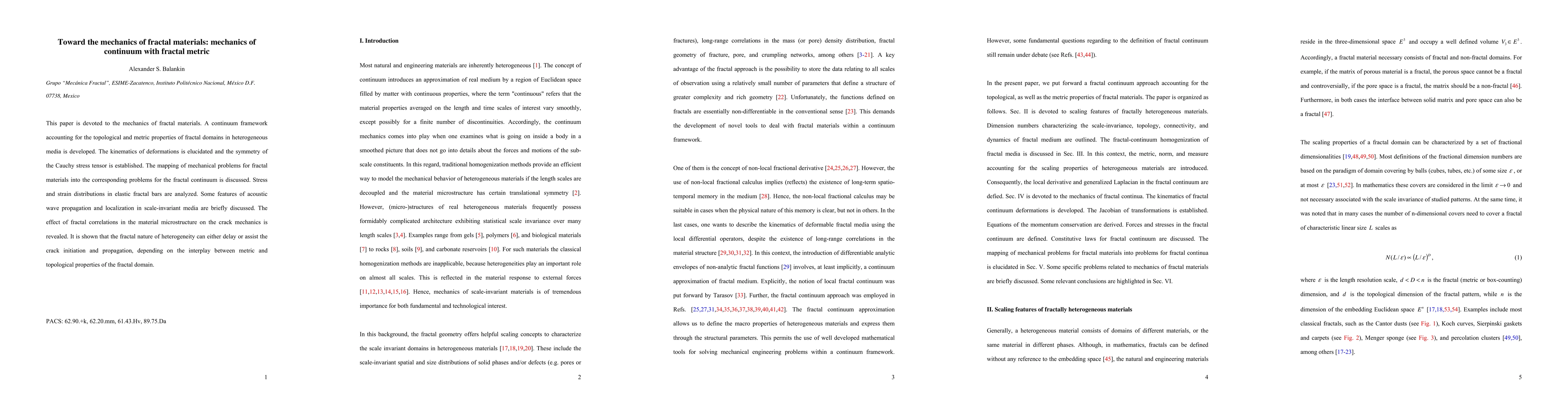 This paper is devoted to the mechanics of fractal materials. A continuum framework accounting for the topological and metric properties of fractal domains in heterogeneous media is developed. The kinematics of deformations is elucidated and the symmetry of the Cauchy stress tensor is established. The mapping of mechanical problems for fractal materials into the corresponding problems for the fractal continuum is discussed. Stress and strain distributions in elastic fractal bars are analyzed. Some features of acoustic wave propagation and localization in scale-invariant media are briefly discussed. The effect of fractal correlations in the material microstructure on the crack mechanics is revealed. It is shown that the fractal nature of heterogeneity can either delay or assist the crack initiation and propagation, depending on the interplay between metric and topological properties of the fractal domain.
