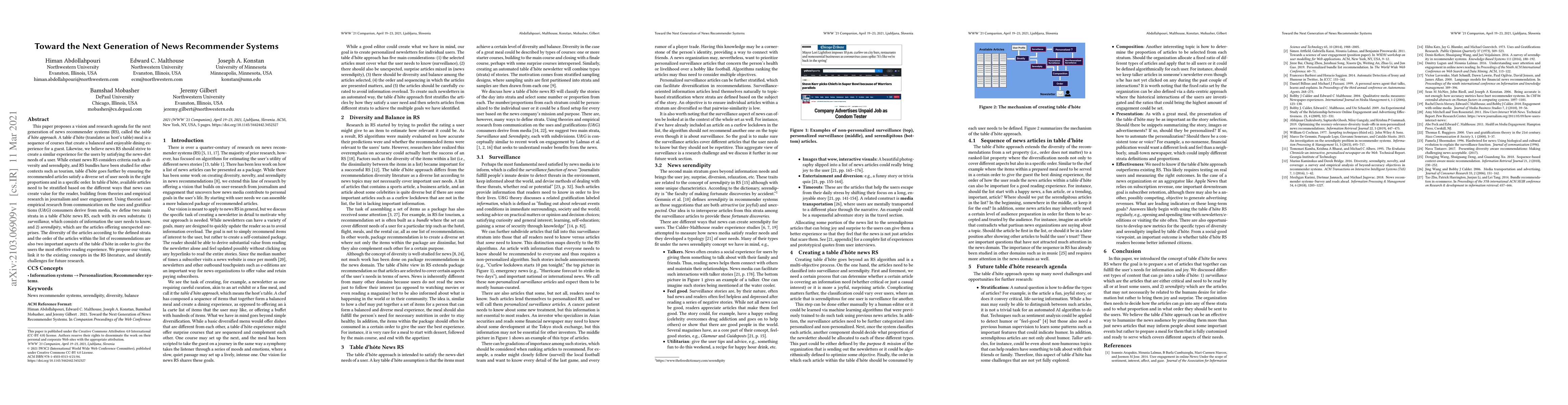 This paper proposes a vision and research agenda for the next generation of news recommender systems (RS), called the table d'hote approach. A table d'hote (translates as host's table) meal is a sequence of courses that create a balanced and enjoyable dining experience for a guest. Likewise, we believe news RS should strive to create a similar experience for the users by satisfying the news-diet needs of a user. While extant news RS considers criteria such as diversity and serendipity, and RS bundles have been studied for other contexts such as tourism, table d'hote goes further by ensuring the recommended articles satisfy a diverse set of user needs in the right proportions and in a specific order. In table d'hote, available articles need to be stratified based on the different ways that news can create value for the reader, building from theories and empirical research in journalism and user engagement. Using theories and empirical research from communication on the uses and gratifications (U&G) consumers derive from media, we define two main strata in a table d'hote news RS, each with its own substrata: 1) surveillance, which consists of information the user needs to know, and 2) serendipity, which are the articles offering unexpected surprises. The diversity of the articles according to the defined strata and the order of the articles within the list of recommendations are also two important aspects of the table d'hote in order to give the users the most effective reading experience. We propose our vision, link it to the existing concepts in the RS literature, and identify challenges for future research.