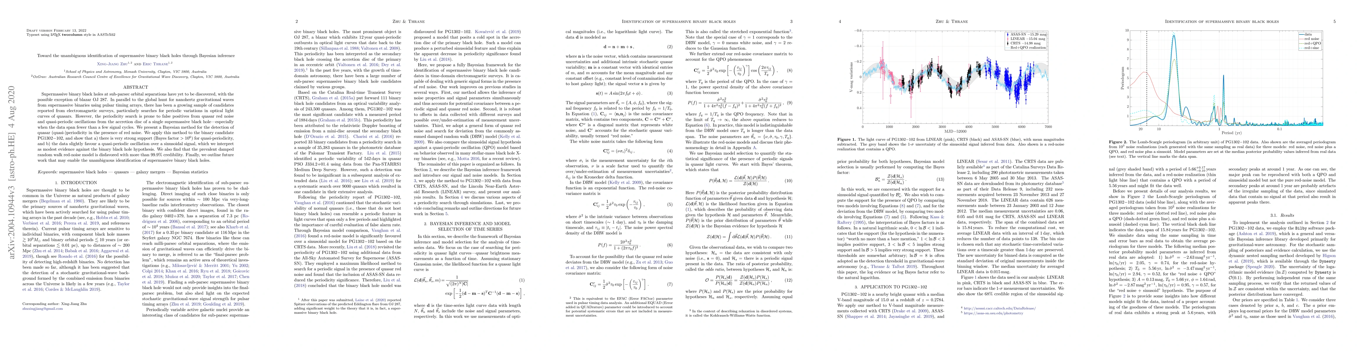 This paper introduces a Bayesian inference method for detecting quasi-periodicity in quasar light curves, aiming to identify supermassive binary black holes. The method is applied to the candidate PG1302$-$102, finding strong support for quasi-periodicity but slight preference for a single black hole model, thus providing modest evidence against the binary hypothesis.