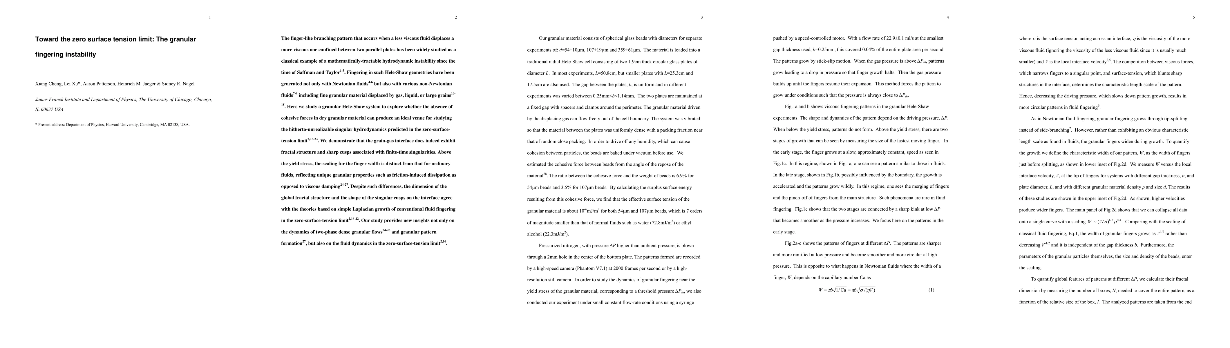 The finger-like branching pattern that occurs when a less viscous fluid displaces a more viscous one confined between two parallel plates has been widely studied as a classical example of a mathematically-tractable hydrodynamic instability since the time of Saffman and Taylor. Fingering in such Hele-Shaw geometries have been generated not only with Newtonian fluids but also with various non-Newtonian fluids including fine granular material displaced by gas, liquid, or large grains. Here we study a granular Hele-Shaw system to explore whether the absence of cohesive forces in dry granular material can produce an ideal venue for studying the hitherto-unrealizable singular hydrodynamics predicted in the zero-surface-tension limit. We demonstrate that the grain-gas interface does indeed exhibit fractal structure and sharp cusps associated with finite-time singularities. Above the yield stress, the scaling for the finger width is distinct from that for ordinary fluids, reflecting unique granular properties such as friction-induced dissipation as opposed to viscous damping. Despite such differences, the dimension of the global fractal structure and the shape of the singular cusps on the interface agree with the theories based on simple Laplacian growth of conventional fluid fingering in the zero-surface-tension limit. Our study provides new insights not only on the dynamics of two-phase dense granular flows and granular pattern formation, but also on the fluid dynamics in the zero-surface-tension limit.