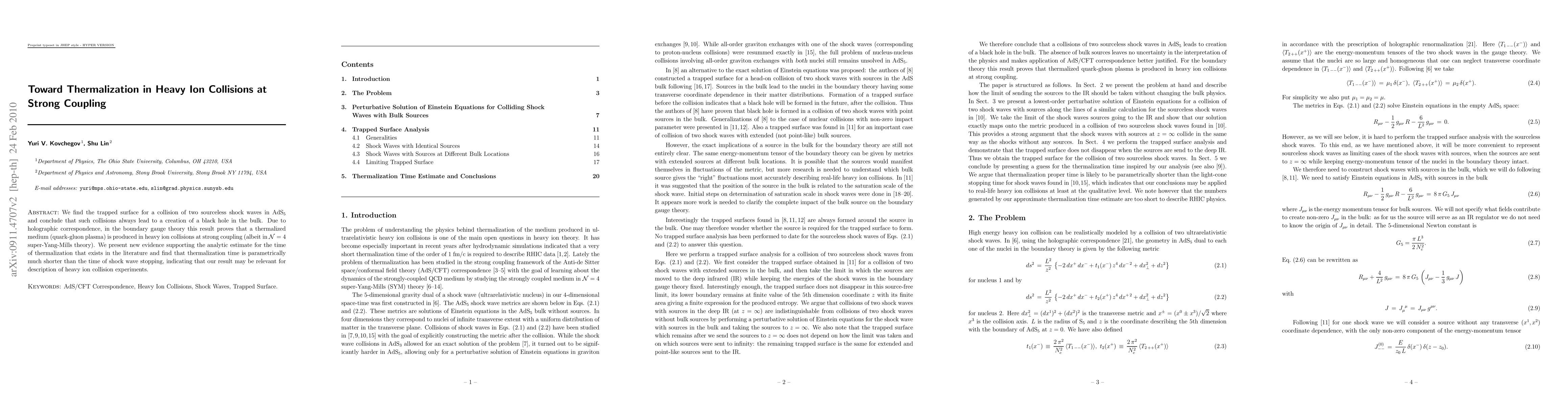 We find the trapped surface for a collision of two sourceless shock waves in AdS$_5$ and conclude that such collisions always lead to a creation of a black hole in the bulk. Due to holographic correspondence, in the boundary gauge theory this result proves that a thermalized medium (quark-gluon plasma) is produced in heavy ion collisions at strong coupling (albeit in ${\cal N} =4$ super-Yang-Mills theory). We present new evidence supporting the analytic estimate for the time of thermalization that exists in the literature and find that thermalization time is parametrically much shorter than the time of shock wave stopping, indicating that our result may be relevant for description of heavy ion collision experiments.