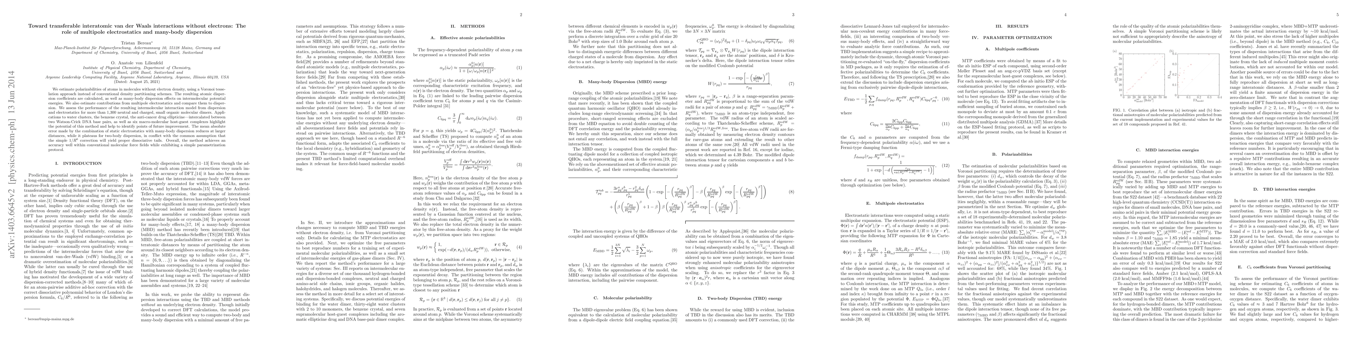 We estimate polarizabilities of atoms in molecules without electron density, using a Voronoi tesselation approach instead of conventional density partitioning schemes. The resulting atomic dispersion coefficients are calculated, as well as many-body dispersion effects on intermolecular potential energies. We also estimate contributions from multipole electrostatics and compare them to dispersion. We assess the performance of the resulting intermolecular interaction model from dispersion and electrostatics for more than 1,300 neutral and charged, small organic molecular dimers. Applications to water clusters, the benzene crystal, the anti-cancer drug ellipticine---intercalated between two Watson-Crick DNA base pairs, as well as six macro-molecular host-guest complexes highlight the potential of this method and help to identify points of future improvement. The mean absolute error made by the combination of static electrostatics with many-body dispersion reduces at larger distances, while it plateaus for two-body dispersion, in conflict with the common assumption that the simple $1/R^6$ correction will yield proper dissociative tails. Overall, the method achieves an accuracy well within conventional molecular force fields while exhibiting a simple parametrization protocol.