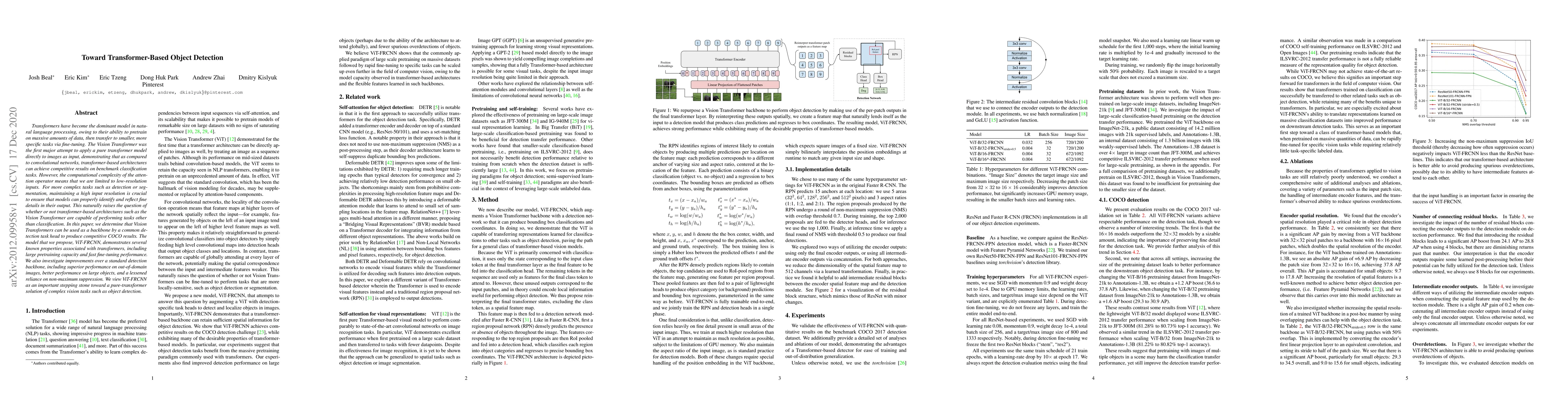 Transformers have become the dominant model in natural language processing, owing to their ability to pretrain on massive amounts of data, then transfer to smaller, more specific tasks via fine-tuning. The Vision Transformer was the first major attempt to apply a pure transformer model directly to images as input, demonstrating that as compared to convolutional networks, transformer-based architectures can achieve competitive results on benchmark classification tasks. However, the computational complexity of the attention operator means that we are limited to low-resolution inputs. For more complex tasks such as detection or segmentation, maintaining a high input resolution is crucial to ensure that models can properly identify and reflect fine details in their output. This naturally raises the question of whether or not transformer-based architectures such as the Vision Transformer are capable of performing tasks other than classification. In this paper, we determine that Vision Transformers can be used as a backbone by a common detection task head to produce competitive COCO results. The model that we propose, ViT-FRCNN, demonstrates several known properties associated with transformers, including large pretraining capacity and fast fine-tuning performance. We also investigate improvements over a standard detection backbone, including superior performance on out-of-domain images, better performance on large objects, and a lessened reliance on non-maximum suppression. We view ViT-FRCNN as an important stepping stone toward a pure-transformer solution of complex vision tasks such as object detection.