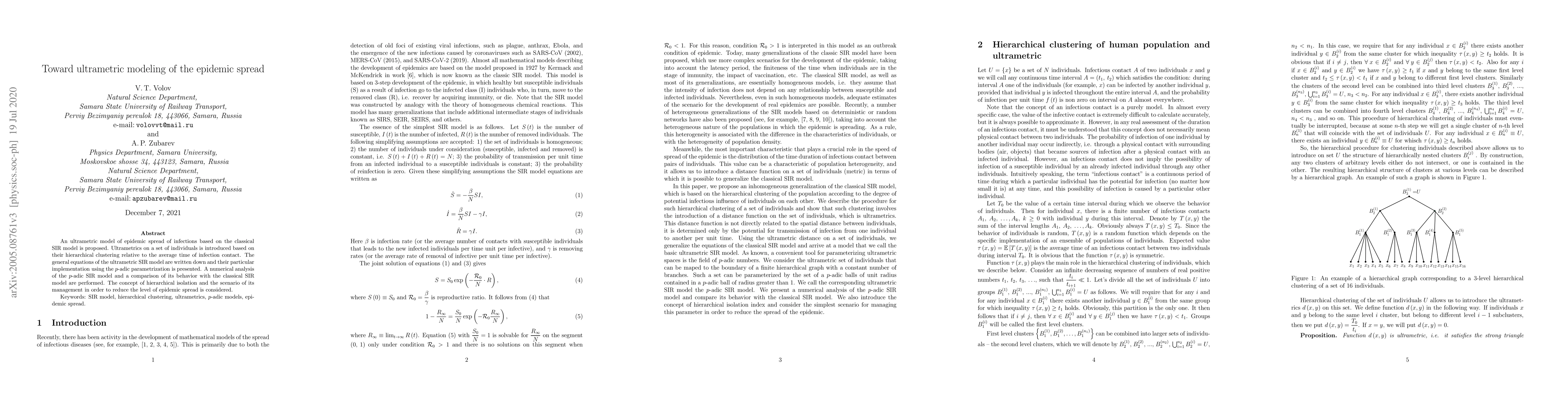 An ultrametric model of epidemic spread of infections based on the classical SIR model is proposed. Ultrametrics on a set of individuals based on theire hierarchical clustering relativly to the average time of infectious contact is introduced. The general equations of the ultrametric SIR model are written down and their particular implementation using $p$-adic parameterization is presented. A numerical analysis of the $p$-adic SIR model and a comparison of its behavior with the classical SIR model are performed. The concept of hierarchical isolation and the scenario of its management in order to reduce the level of epidemic spread is considered.