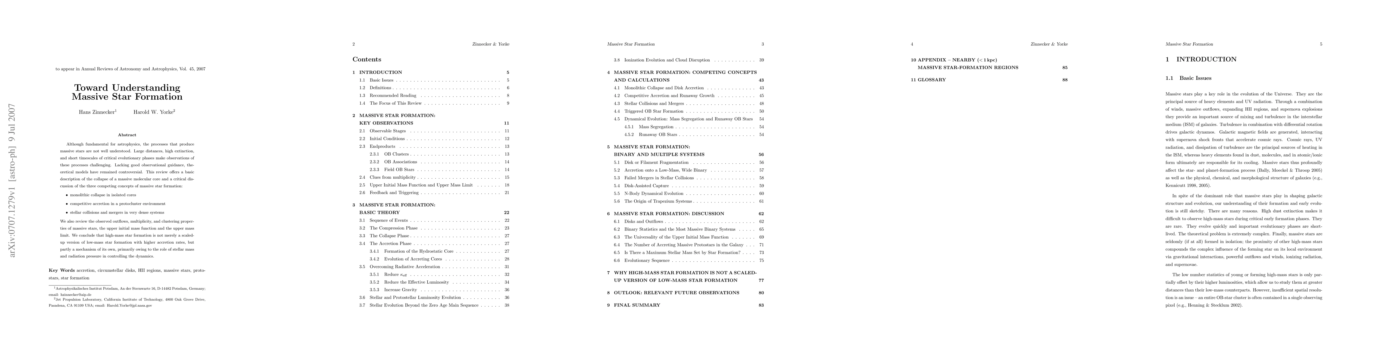 Although fundamental for astrophysics, the processes that produce massive stars are not well understood. Large distances, high extinction, and short timescales of critical evolutionary phases make observations of these processes challenging. Lacking good observational guidance, theoretical models have remained controversial. This review offers a basic description of the collapse of a massive molecular core and a critical discussion of the three competing concepts of massive star formation: - monolithic collapse in isolated cores - competitive accretion in a protocluster environment - stellar collisions and mergers in very dense systems We also review the observed outflows, multiplicity, and clustering properties of massive stars, the upper initial mass function and the upper mass limit. We conclude that high-mass star formation is not merely a scaled-up version of low-mass star formation with higher accretion rates, but partly a mechanism of its own, primarily owing to the role of stellar mass and radiation pressure in controlling the dynamics.