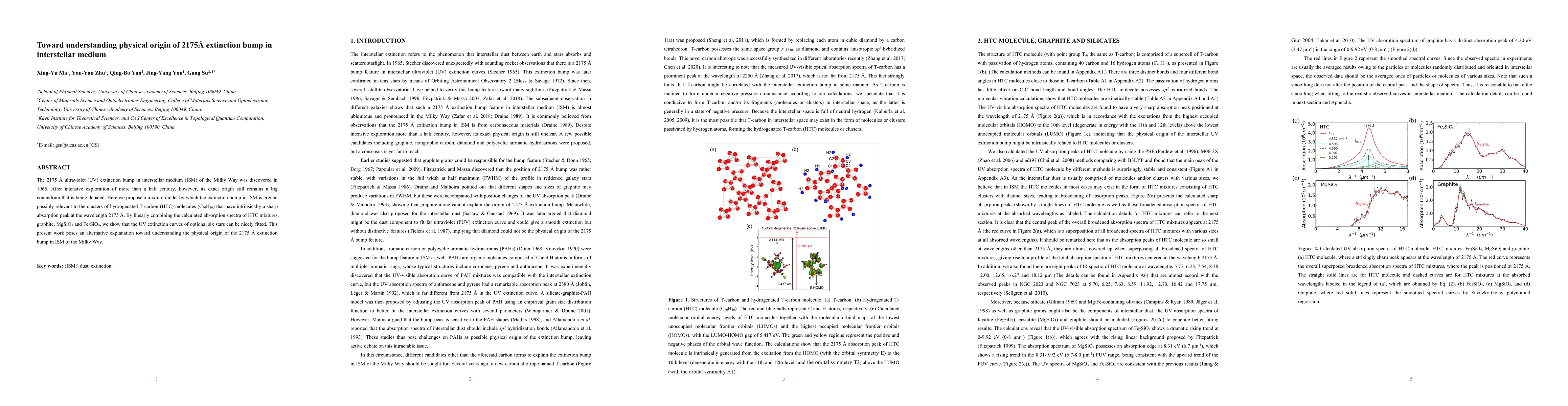 This paper proposes that the 2175 Å UV extinction bump in the Milky Way's interstellar medium could be due to clusters of hydrogenated T-carbon (HTC) molecules. By fitting the calculated absorption spectra of HTC mixtures with other materials, the authors demonstrate a potential explanation for the observed extinction curves of six stars.