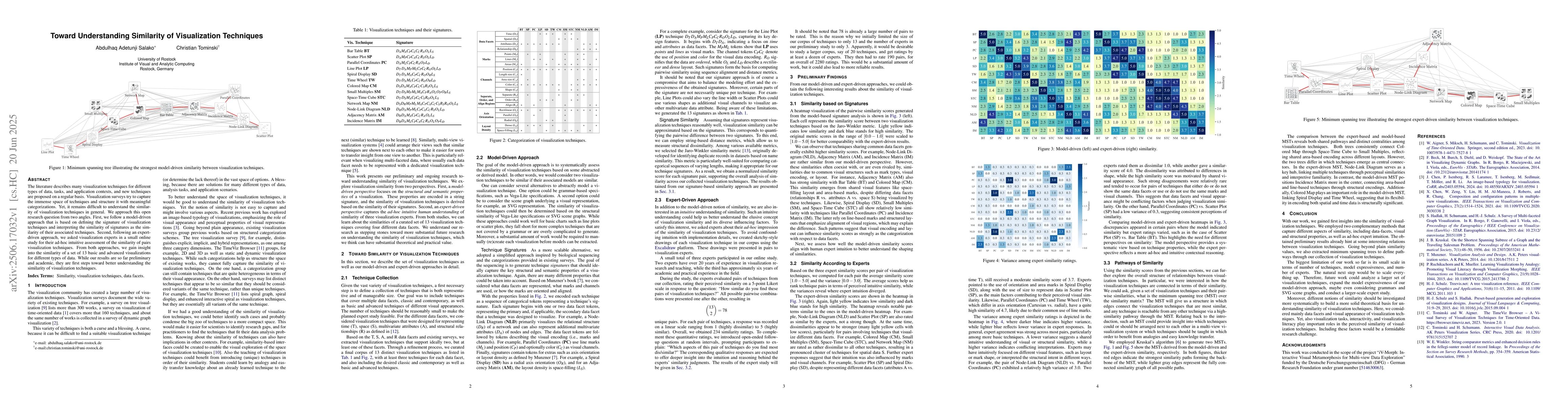 The literature describes many visualization techniques for different types of data, tasks, and application contexts, and new techniques are proposed on a regular basis. Visualization surveys try to capture the immense space of techniques and structure it with meaningful categorizations. Yet, it remains difficult to understand the similarity of visualization techniques in general. We approach this open research question from two angles. First, we follow a model-driven approach that is based on defining the signature of visualization techniques and interpreting the similarity of signatures as the similarity of their associated techniques. Second, following an expert-driven approach, we asked visualization experts in a small online study for their ad-hoc intuitive assessment of the similarity of pairs visualization techniques. From both approaches, we gain insight into the similarity of a set of 13 basic and advanced visualizations for different types of data. While our results are so far preliminary and academic, they are first steps toward better understanding the similarity of visualization techniques.