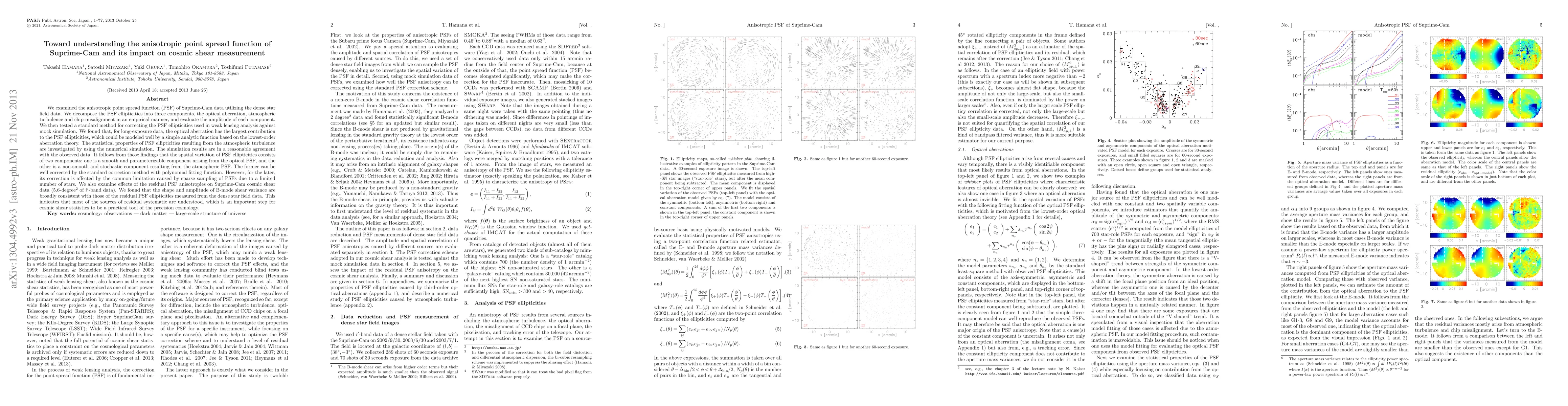 We examined the anisotropic point spread function (PSF) of Suprime-Cam data utilizing dense star field data. We decomposed the PSF ellipticities into three components, the optical aberration, atmospheric turbulence, and chip-misalignment in an empirical manner, and evaluated the amplitude of each component. We found that, for long-exposure data, the optical aberration has the largest contribution to the PSF ellipticities, which could be modeled well by a simple analytic function based on the lowest-order aberration theory. The statistical properties of PSF ellipticities resulting from the atmospheric turbulence were investigated by using the numerical simulations. The simulation results are in a reasonable agreement with the observed data. It is also found that the optical PSF can be well corrected by the standard correction method with a polynomial fitting function. However, for the atmospheric PSF, its correction is affected by the common limitation caused by sparse sampling of PSFs due to a limited number of stars. We also examined the effects of the residual PSF anisotropies on Suprime-Cam cosmic shear data. We found that the shape and amplitude of the B-mode shear variance are broadly consistent with those of the residual PSF ellipticities measured from the dense star field data. This indicates that most of the sources of residual systematic are understood, which is an important step for cosmic shear statistics to be a practical tool of the precision cosmology.