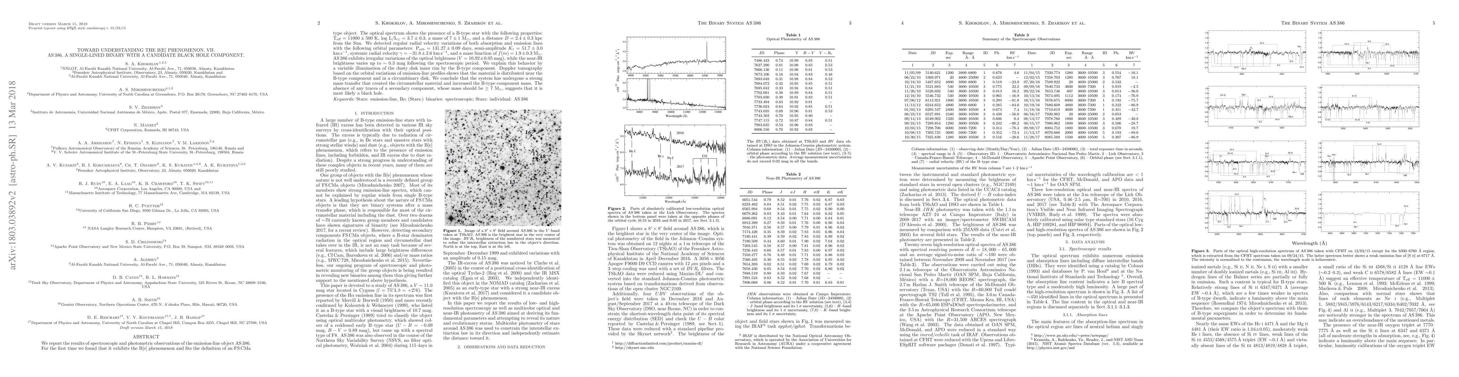 We report the results of spectroscopic and photometric observations of the emission-line object AS 386. For the first time, we found that it exhibits the B[e] phenomenon and fits the definition of an FS CMa type object. The optical spectrum shows the presence of a B-type star with the following properties: T_ eff = 11000+/-500 K, log L/L_sun = 3.7+/-0.3, a mass of 7+/-1 M_sun, and a distance D = 2.4+/-0.3 kpc from the Sun. We detected regular radial velocity variations of both absorption and emission lines with the following orbital parameters: P_orb = 131.27+/-0.09 days, semi-amplitude K_1 = 51.7+/-3.0 km/s, systemic radial velocity gamma = -31.8+/-2.6 km/s, and a mass function of f(m) = 1.9+/-0.3 M_sun. AS 386 exhibits irregular variations of the optical brightness (V=10.92+/-0.05 mag), while the near-IR brightness varies up to ~0.3 mag following the spectroscopic period. We explain this behavior by a variable illumination of the dusty disk inner rim by the B-type component. Doppler tomography based on the orbital variations of emission-line profiles shows that the material is distributed near the B-type component and in a circumbinary disk. We conclude that the system has undergone a strong mass transfer that created the circumstellar material and increased the B-type component mass. The absence of any traces of a secondary component, whose mass should be >= 7 M_sun, suggests that it is most likely a black hole.