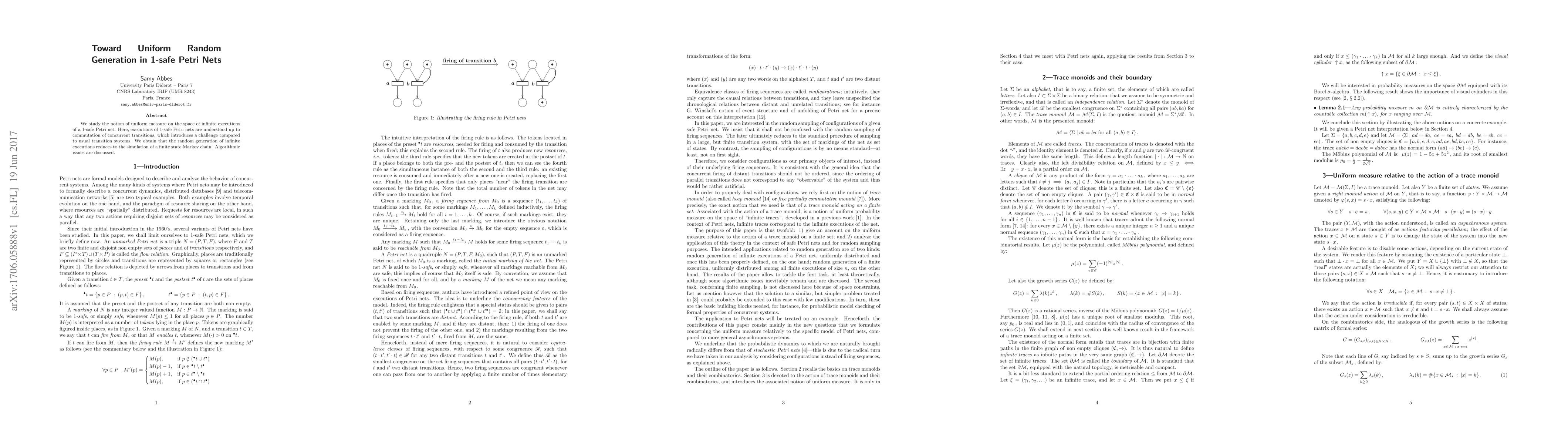 This paper investigates the generation of uniform random infinite executions for 1-safe Petri nets, addressing the challenge of concurrent transitions. It concludes that this problem can be reduced to simulating a finite state Markov chain, with a discussion on the associated algorithmic aspects.