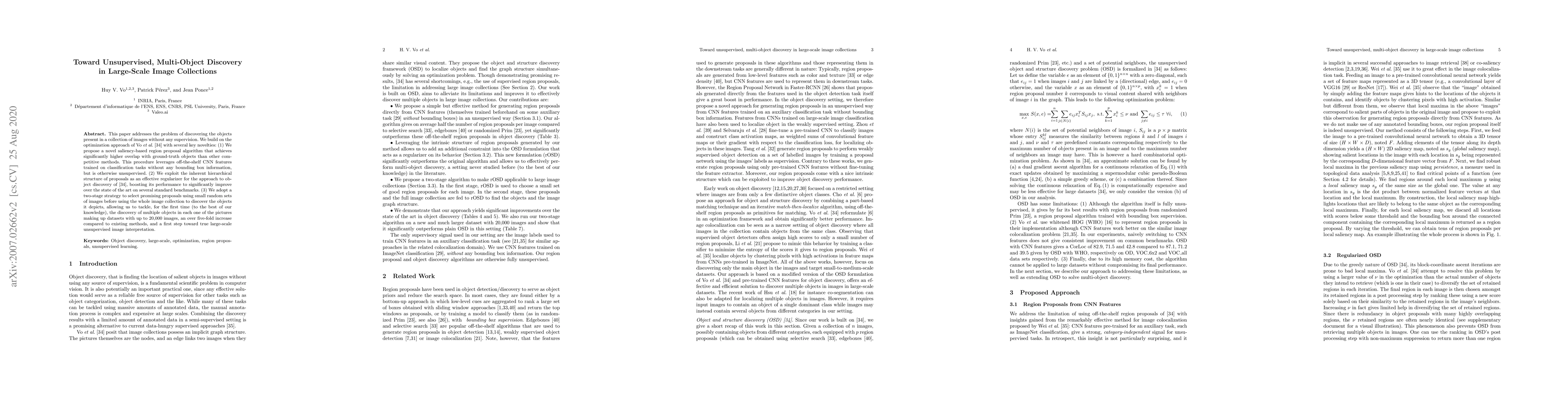 This paper addresses the problem of discovering the objects present in a collection of images without any supervision. We build on the optimization approach of Vo et al. (CVPR'19) with several key novelties: (1) We propose a novel saliency-based region proposal algorithm that achieves significantly higher overlap with ground-truth objects than other competitive methods. This procedure leverages off-the-shelf CNN features trained on classification tasks without any bounding box information, but is otherwise unsupervised. (2) We exploit the inherent hierarchical structure of proposals as an effective regularizer for the approach to object discovery of Vo et al., boosting its performance to significantly improve over the state of the art on several standard benchmarks. (3) We adopt a two-stage strategy to select promising proposals using small random sets of images before using the whole image collection to discover the objects it depicts, allowing us to tackle, for the first time (to the best of our knowledge), the discovery of multiple objects in each one of the pictures making up datasets with up to 20,000 images, an over five-fold increase compared to existing methods, and a first step toward true large-scale unsupervised image interpretation.