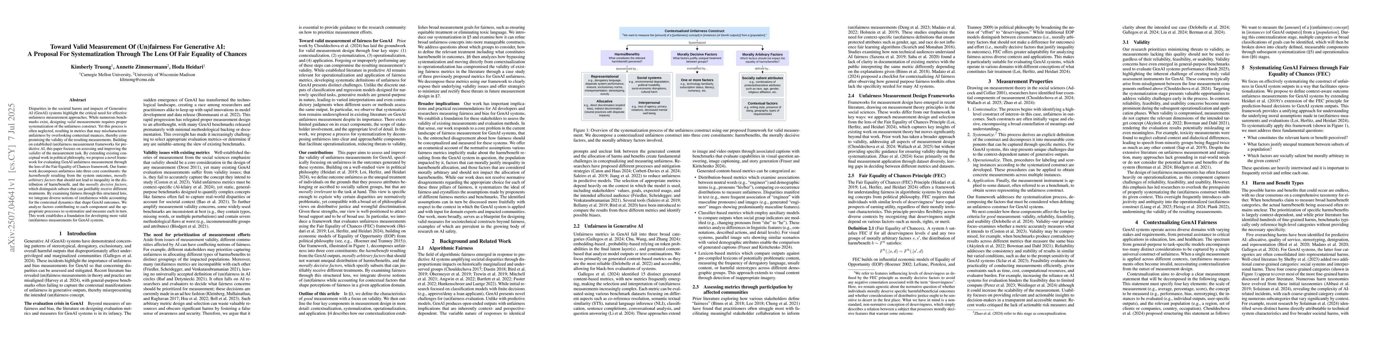 Disparities in the societal harms and impacts of Generative AI (GenAI) systems highlight the critical need for effective unfairness measurement approaches. While numerous benchmarks exist, designing valid measurements requires proper systematization of the unfairness construct. Yet this process is often neglected, resulting in metrics that may mischaracterize unfairness by overlooking contextual nuances, thereby compromising the validity of the resulting measurements. Building on established (un)fairness measurement frameworks for predictive AI, this paper focuses on assessing and improving the validity of the measurement task. By extending existing conceptual work in political philosophy, we propose a novel framework for evaluating GenAI unfairness measurement through the lens of the Fair Equality of Chances framework. Our framework decomposes unfairness into three core constituents: the harm/benefit resulting from the system outcomes, morally arbitrary factors that should not lead to inequality in the distribution of harm/benefit, and the morally decisive factors, which distinguish subsets that can justifiably receive different treatments. By examining fairness through this structured lens, we integrate diverse notions of (un)fairness while accounting for the contextual dynamics that shape GenAI outcomes. We analyze factors contributing to each component and the appropriate processes to systematize and measure each in turn. This work establishes a foundation for developing more valid (un)fairness measurements for GenAI systems.