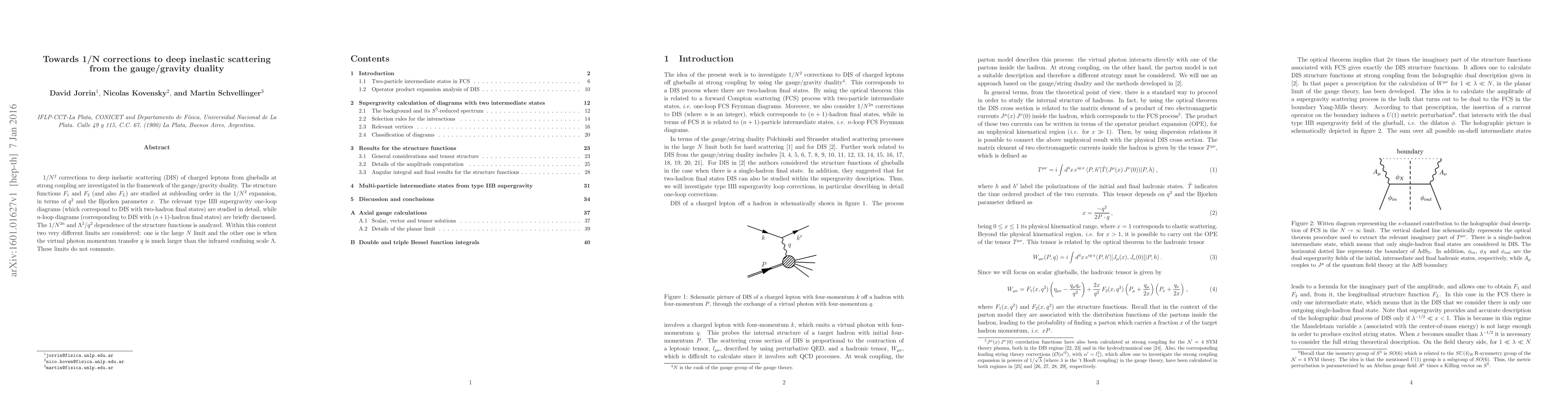 $1/N^2$ corrections to deep inelastic scattering (DIS) of charged leptons from glueballs at strong coupling are investigated in the framework of the gauge/gravity duality. The structure functions $F_1$ and $F_2$ (and also $F_L$) are studied at subleading order in the $1/N^2$ expansion, in terms of $q^2$ and the Bjorken parameter $x$. The relevant type IIB supergravity one-loop diagrams (which correspond to DIS with two-hadron final states) are studied in detail, while $n$-loop diagrams (corresponding to DIS with $(n+1)$-hadron final states) are briefly discussed. The $1/N^{2n}$ and $\Lambda^2/q^2$ dependence of the structure functions is analyzed. Within this context two very different limits are considered: one is the large $N$ limit and the other one is when the virtual photon momentum transfer $q$ is much larger than the infrared confining scale $\Lambda$. These limits do not commute.
