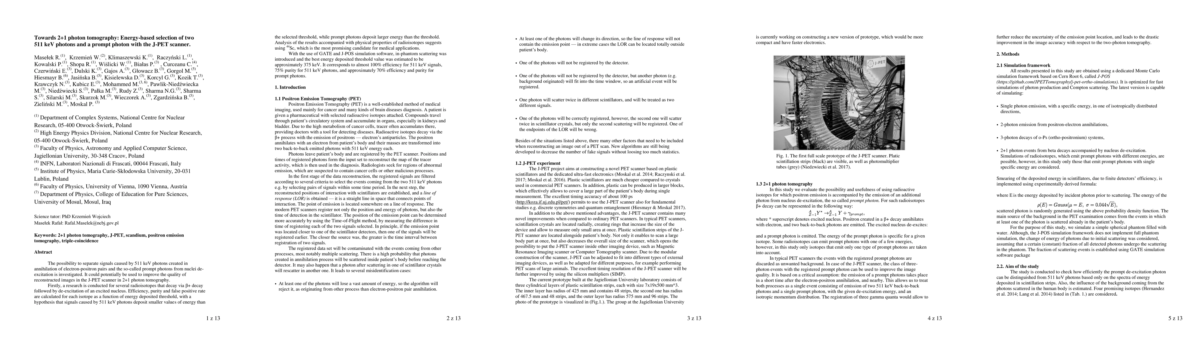 The possibility to separate signals caused by 511 keV photons created in annihilation of electron-positron pairs and the so-called prompt photons from nuclei de- excitation is investigated. It could potentially be used to improve the quality of reconstructed images in the J-PET scanner in 2+1 photon tomography. Firstly, a research is conducted for several radioisotopes that decay via \b{eta}+ decay followed by de-excitation of an excited nucleus. Efficiency, purity and false positive rate are calculated for each isotope as a function of energy deposited threshold, with a hypothesis that signals caused by 511 keV photons deposit smaller values of energy than 1 z 13the selected threshold, while prompt photons deposit larger energy than the threshold. Analysis of the results accompanied with physical properties of radioisotopes suggests using 44 Sc, which is the most promising candidate for medical applications. With the use of GATE and J-POS simulation software, in-phantom scattering was introduced and the best energy deposited threshold value was estimated to be approximately 375 keV. It corresponds to almost 100% efficiency for 511 keV signals, 75% purity for 511 keV photons, and approximately 70% efficiency and purity for prompt photons.