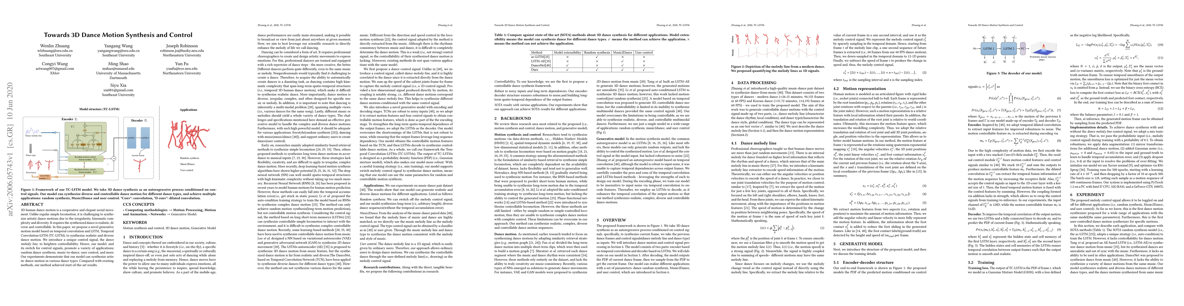 This paper proposes a TC-LSTM generative motion model for synthesizing realistic and diverse 3D dance motions, enhanced by a dance melody line for controllability. The model achieves state-of-the-art results in various dance types and applications, including random dance synthesis and music-to-dance conversion.