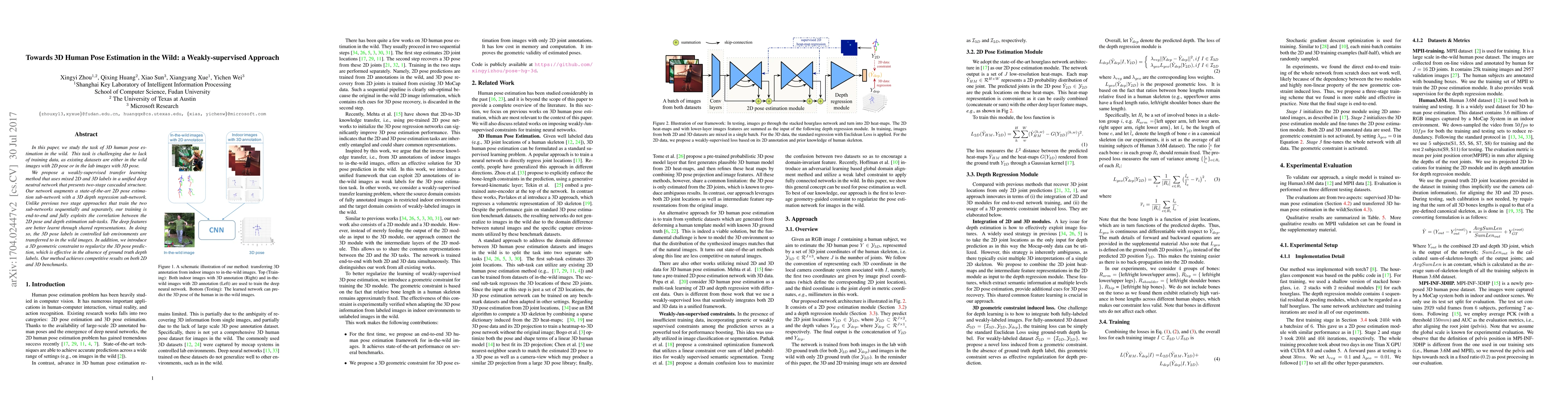 This paper proposes a weakly-supervised transfer learning method for 3D human pose estimation in natural scenes, leveraging mixed 2D and 3D labels. The approach uses a unified deep neural network with a cascaded structure, achieving end-to-end training that better exploits correlations between 2D pose and depth estimation, and introduces a 3D geometric constraint to regularize predictions.