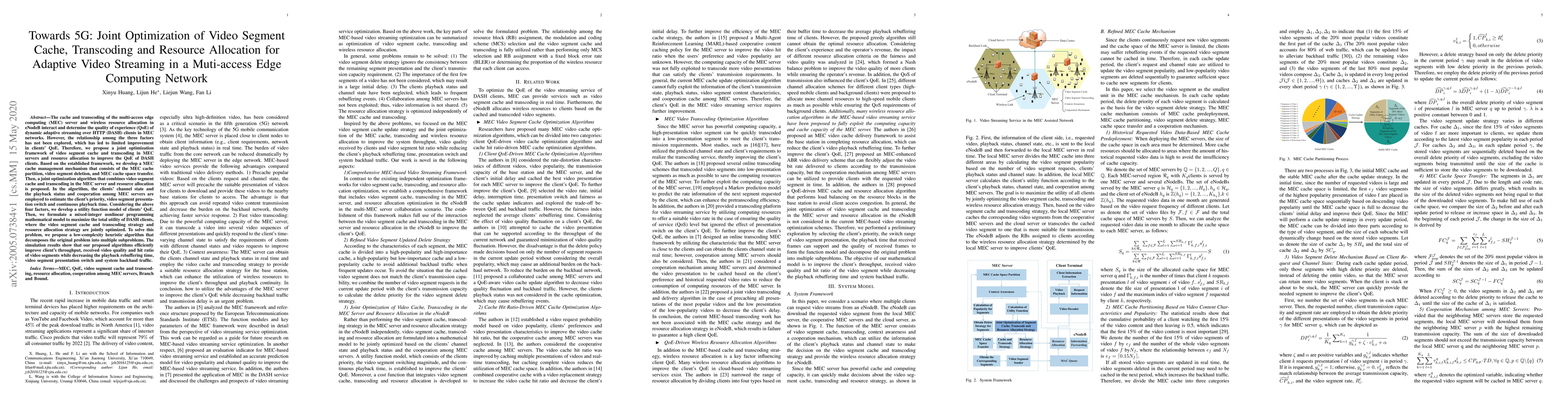 This paper proposes a joint optimization framework for video segment cache, transcoding, and resource allocation in multi-access edge computing (MEC) networks to enhance the quality of experience (QoE) for adaptive video streaming. The developed algorithm improves throughput, video quality, and reduces rebuffering time by leveraging channel state, playback status, and inter-server cooperation.