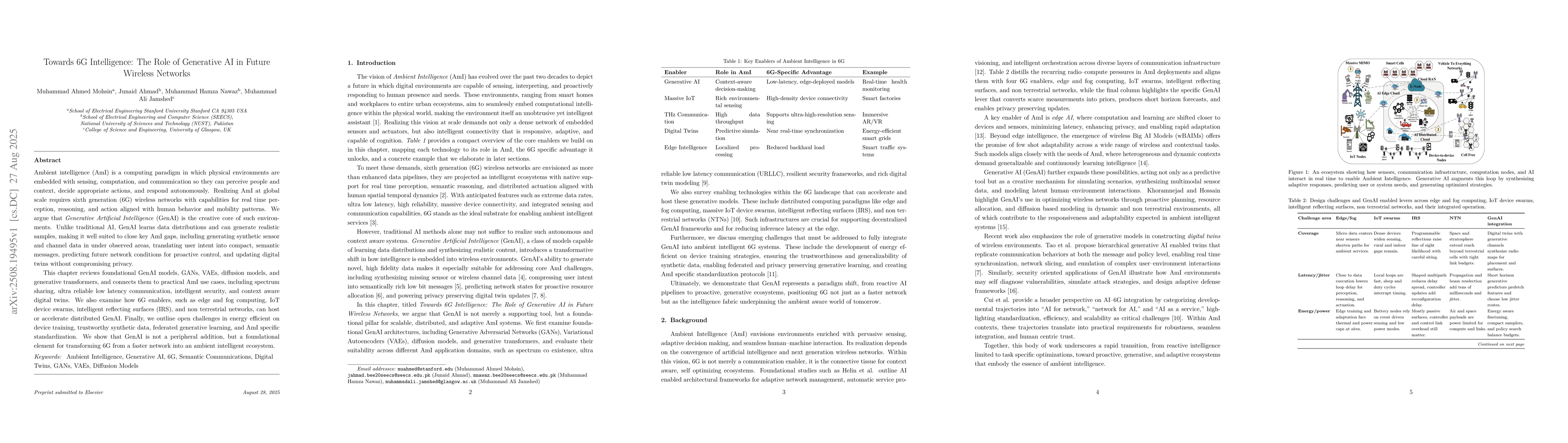 Ambient intelligence (AmI) is a computing paradigm in which physical environments are embedded with sensing, computation, and communication so they can perceive people and context, decide appropriate actions, and respond autonomously. Realizing AmI at global scale requires sixth generation (6G) wireless networks with capabilities for real time perception, reasoning, and action aligned with human behavior and mobility patterns. We argue that Generative Artificial Intelligence (GenAI) is the creative core of such environments. Unlike traditional AI, GenAI learns data distributions and can generate realistic samples, making it well suited to close key AmI gaps, including generating synthetic sensor and channel data in under observed areas, translating user intent into compact, semantic messages, predicting future network conditions for proactive control, and updating digital twins without compromising privacy. This chapter reviews foundational GenAI models, GANs, VAEs, diffusion models, and generative transformers, and connects them to practical AmI use cases, including spectrum sharing, ultra reliable low latency communication, intelligent security, and context aware digital twins. We also examine how 6G enablers, such as edge and fog computing, IoT device swarms, intelligent reflecting surfaces (IRS), and non terrestrial networks, can host or accelerate distributed GenAI. Finally, we outline open challenges in energy efficient on device training, trustworthy synthetic data, federated generative learning, and AmI specific standardization. We show that GenAI is not a peripheral addition, but a foundational element for transforming 6G from a faster network into an ambient intelligent ecosystem.