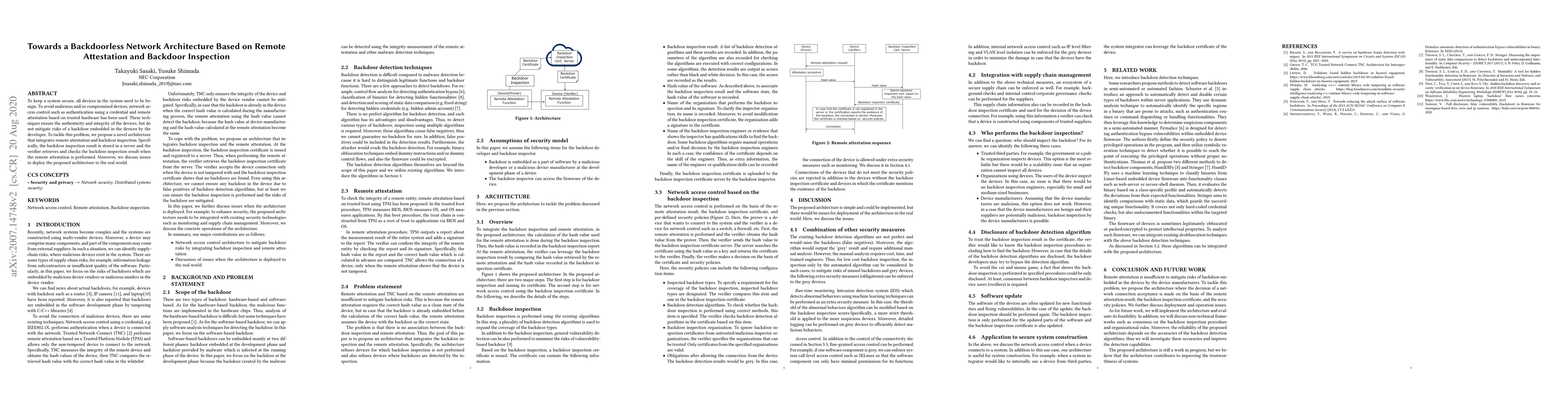 This paper proposes a novel network architecture integrating remote attestation and backdoor inspection to ensure device authenticity and detect backdoors. The architecture stores backdoor inspection results on a server, which the verifier checks during remote attestation, aiming to mitigate risks from developer-embedded backdoors. The paper also discusses deployment challenges for real-world implementation.
