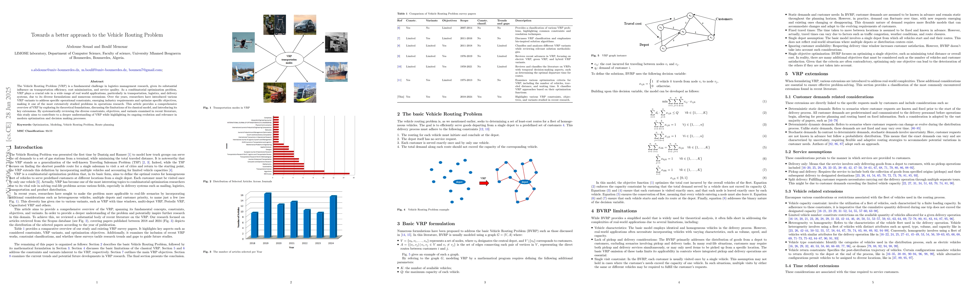 The Vehicle Routing Problem (VRP) is a fundamental challenge in logistics management research, given its substantial influence on transportation efficiency, cost minimization, and service quality. As a combinatorial optimization problem, VRP plays a crucial role in a wide range of real world applications, particularly in transportation, logistics, and delivery systems, due to its diverse formulations and numerous extensions. Over the years, researchers have introduced various VRP variants to address specific operational constraints, emerging industry requirements and optimize specific objectives, making it one of the most extensively studied problems in operations research. This article provides a comprehensive overview of VRP by exploring its theoretical foundations, discussing the limitations of its classical model, and introducing its key extensions. By systematically reviewing the diverse constraints, objectives, and variants examined in recent literature, this study aims to contribute to a deeper understanding of VRP while highlighting its ongoing evolution and relevance in modern optimization and decision making processes.