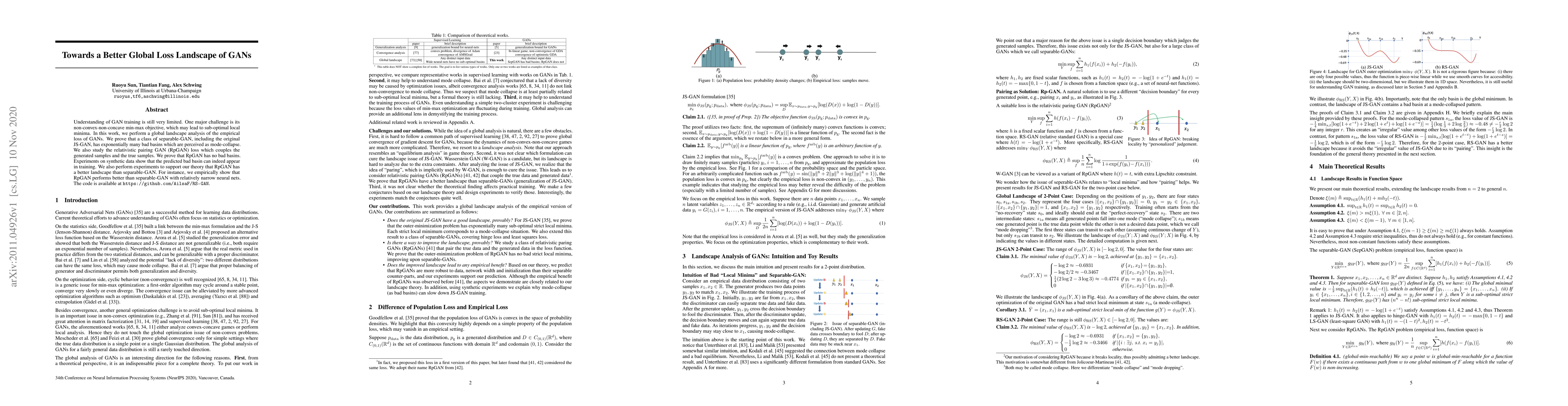 Researchers analyzed the global landscape of Generative Adversarial Networks (GANs) and found that a specific loss function has exponentially many local minima, while another loss function has none, leading to better performance on synthetic data.