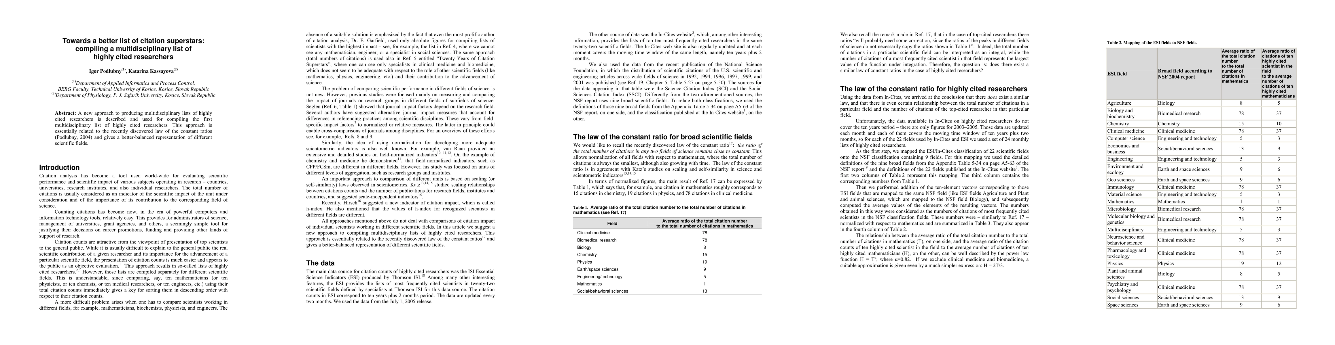 A new approach to producing multidisciplinary lists of highly cited researchers is described and used for compiling a multidisciplinary list of highly cited researchers. This approach is essentially related to the recently discovered law of the constant ratios (Podlubny, 2004) and gives a better-balanced representation of different scientific fields.
