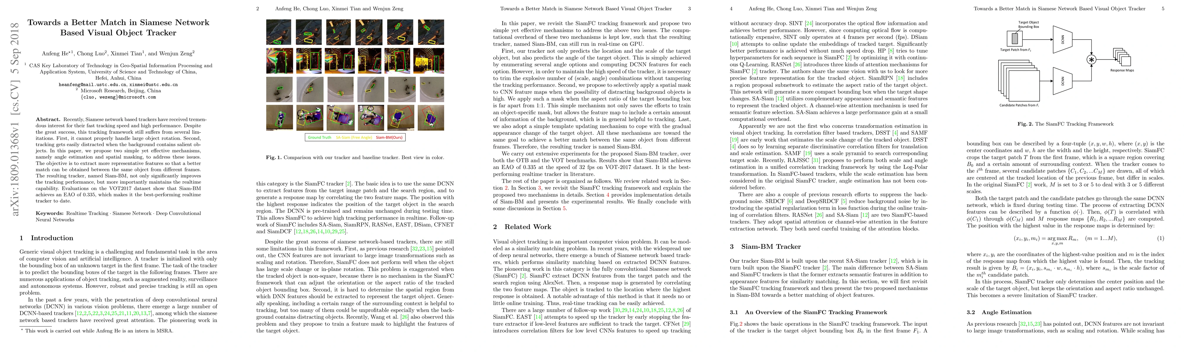 Recently, Siamese network based trackers have received tremendous interest for their fast tracking speed and high performance. Despite the great success, this tracking framework still suffers from several limitations. First, it cannot properly handle large object rotation. Second, tracking gets easily distracted when the background contains salient objects. In this paper, we propose two simple yet effective mechanisms, namely angle estimation and spatial masking, to address these issues. The objective is to extract more representative features so that a better match can be obtained between the same object from different frames. The resulting tracker, named Siam-BM, not only significantly improves the tracking performance, but more importantly maintains the realtime capability. Evaluations on the VOT2017 dataset show that Siam-BM achieves an EAO of 0.335, which makes it the best-performing realtime tracker to date.