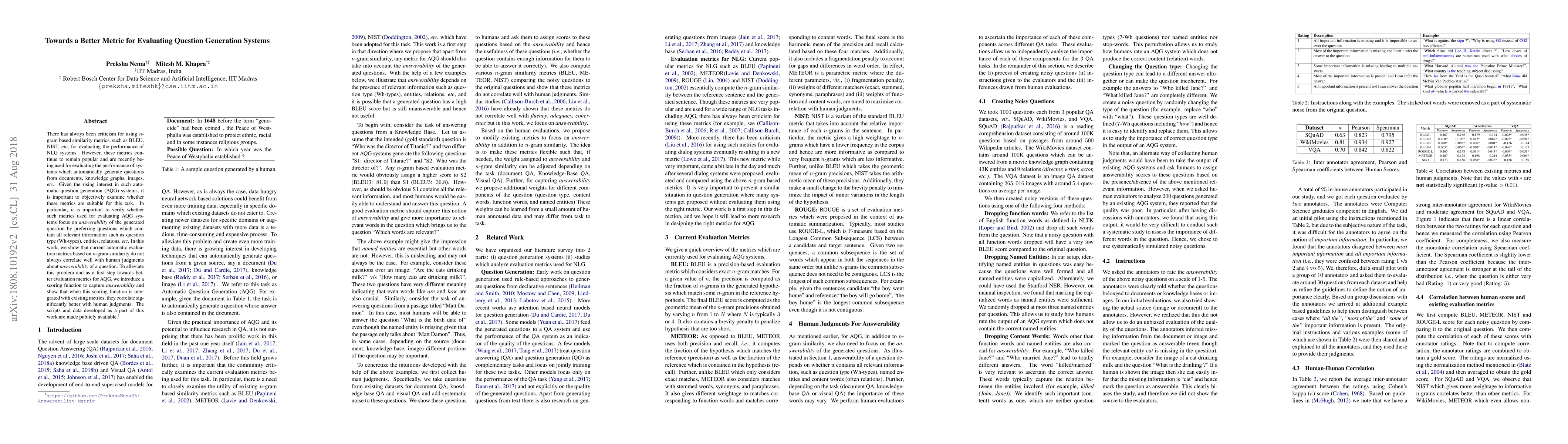 This paper critiques the use of $n$-gram similarity metrics for evaluating automatic question generation systems, finding they do not correlate well with human judgments on question answerability. To address this, the authors introduce a new scoring function focused on answerability, demonstrating improved correlation when combined with existing metrics.