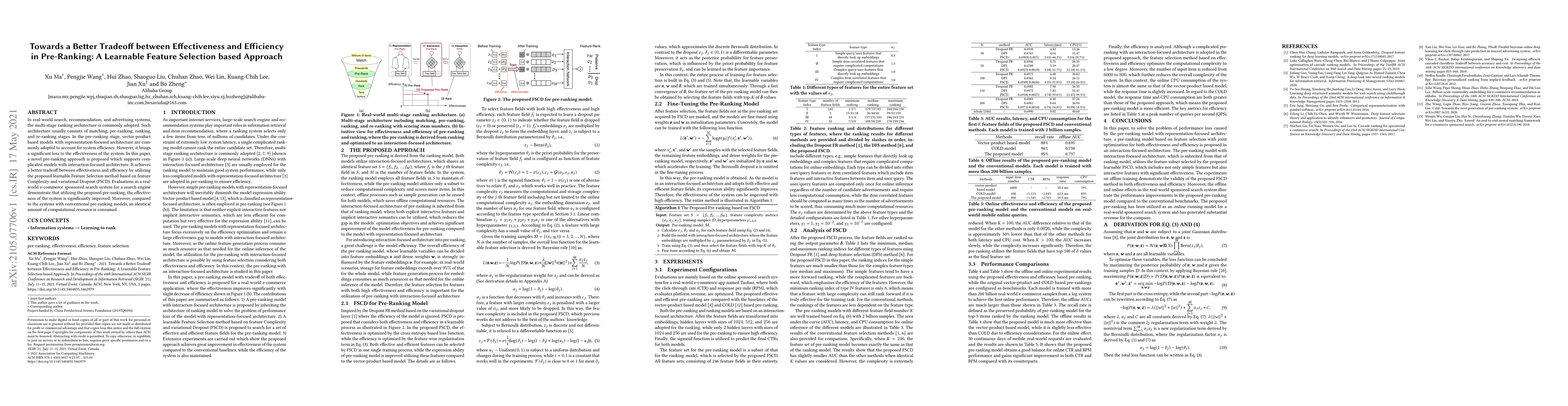 A new pre-ranking approach is proposed to improve effectiveness while maintaining efficiency in search systems, using a learnable feature selection method that balances complexity and variational dropout.