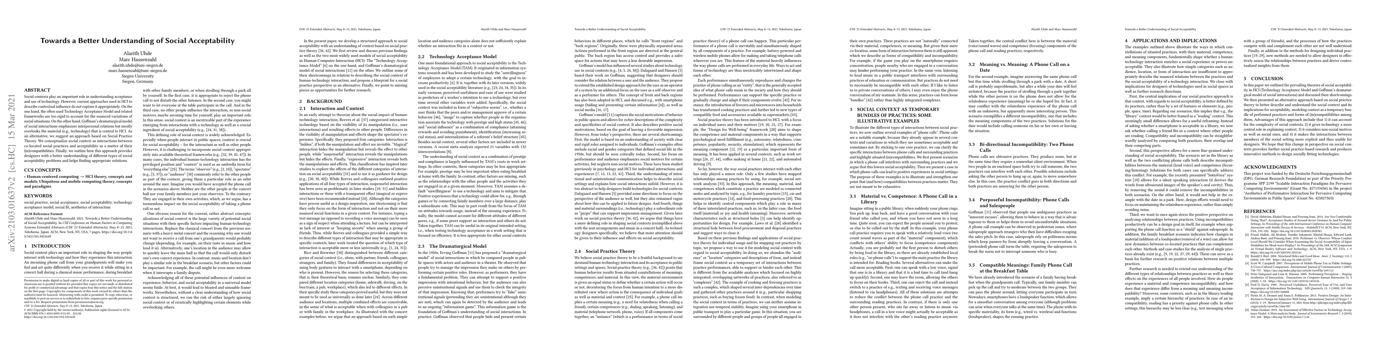 This paper proposes a new approach based on Social Practice Theory to better understand the social acceptability of technology, arguing that current models like the Technology Acceptance Model are too rigid and that Goffman's dramaturgical model overlooks technological elements. It suggests that social context should be viewed as interactions between co-located social practices, offering designers insights into various social acceptability issues and potential solutions.